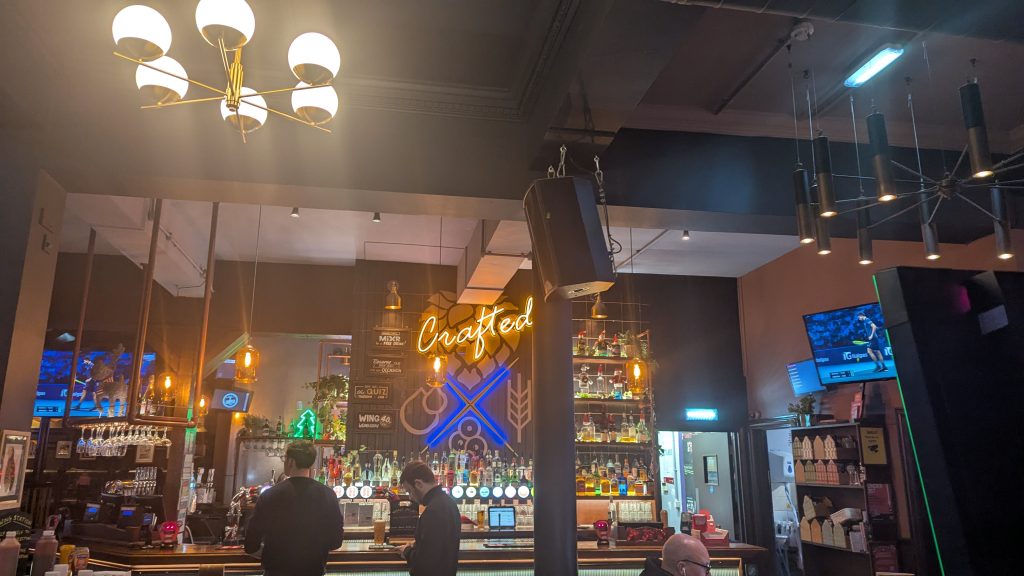 The Chanter is a traditional sports bar on Bread Street, Edinburgh, offering cost-effective pub grub and a wide range of drinks in a venue with many screens and sectioned seating areas.