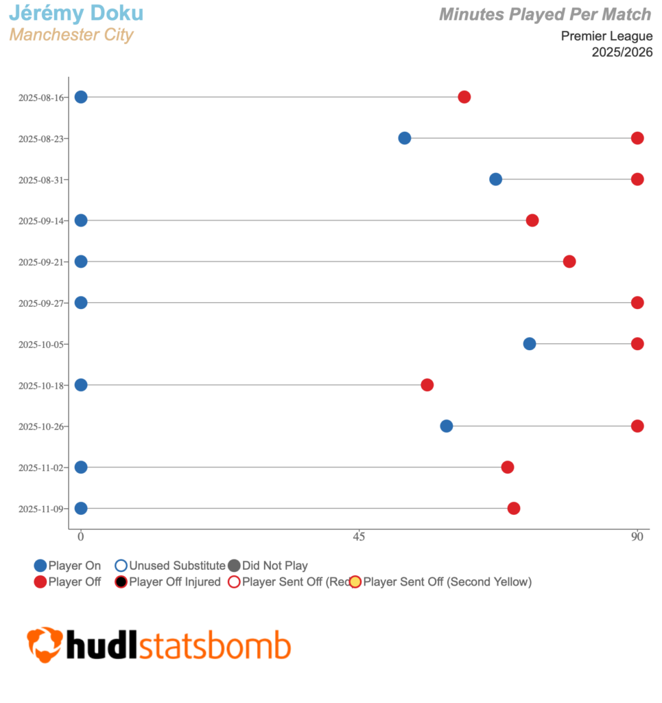 Given City’s upcoming schedule, which consists of 10 matches across all competitions in November and December, it is reasonable to assume that Doku will be a substitute in at least a few of those games.