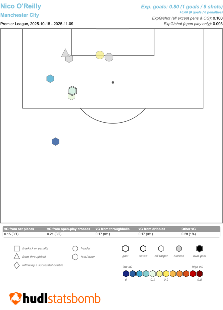 Above: Nico O’Reilly’s shot map over the last four Gameweeks