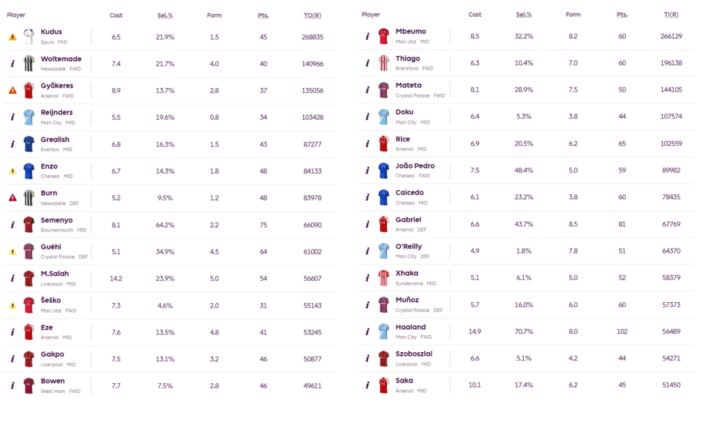 Based on fixtures, form, injuries and bans, these players are currently experiencing considerable transfer activity out (TO(R), below) and in (TI(R), below).