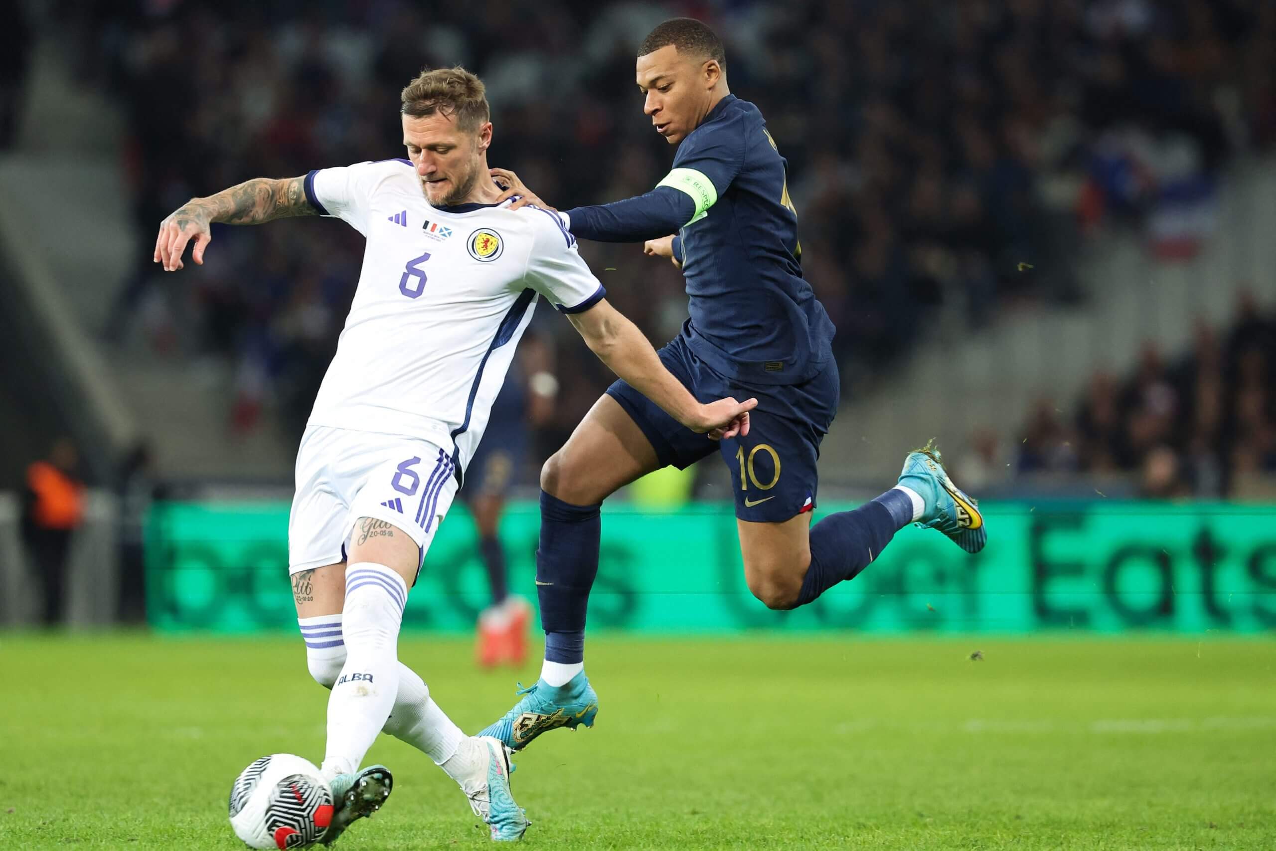 Liam Cooper holds off a challenge from France’s Kylian Mbappe while playing for Scotland (Franck Fife/AFP via Getty Images)