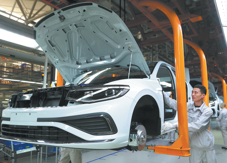 Workers assemble cars on the production line of FAW-Volkswagen in Qingdao, Shandong province, on March 25. LIANG XIAOPENG/FOR CHINA DAILY
