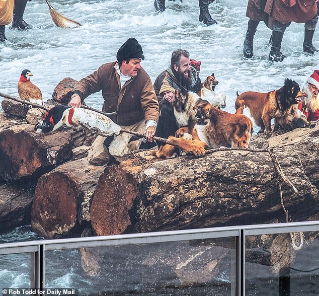 In other sections of the bizarre mural, dogs with the heads of birds run through partially frozen water