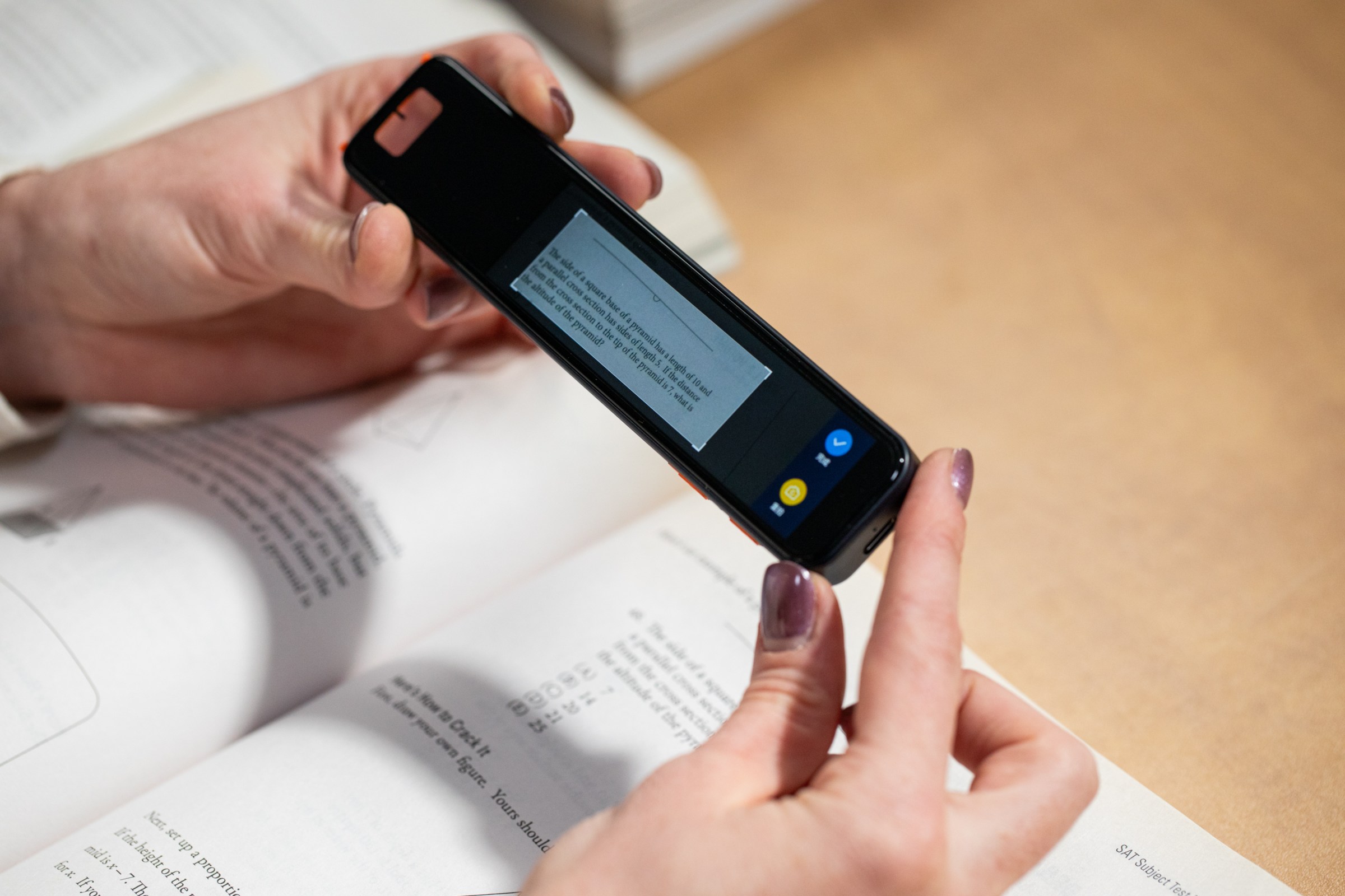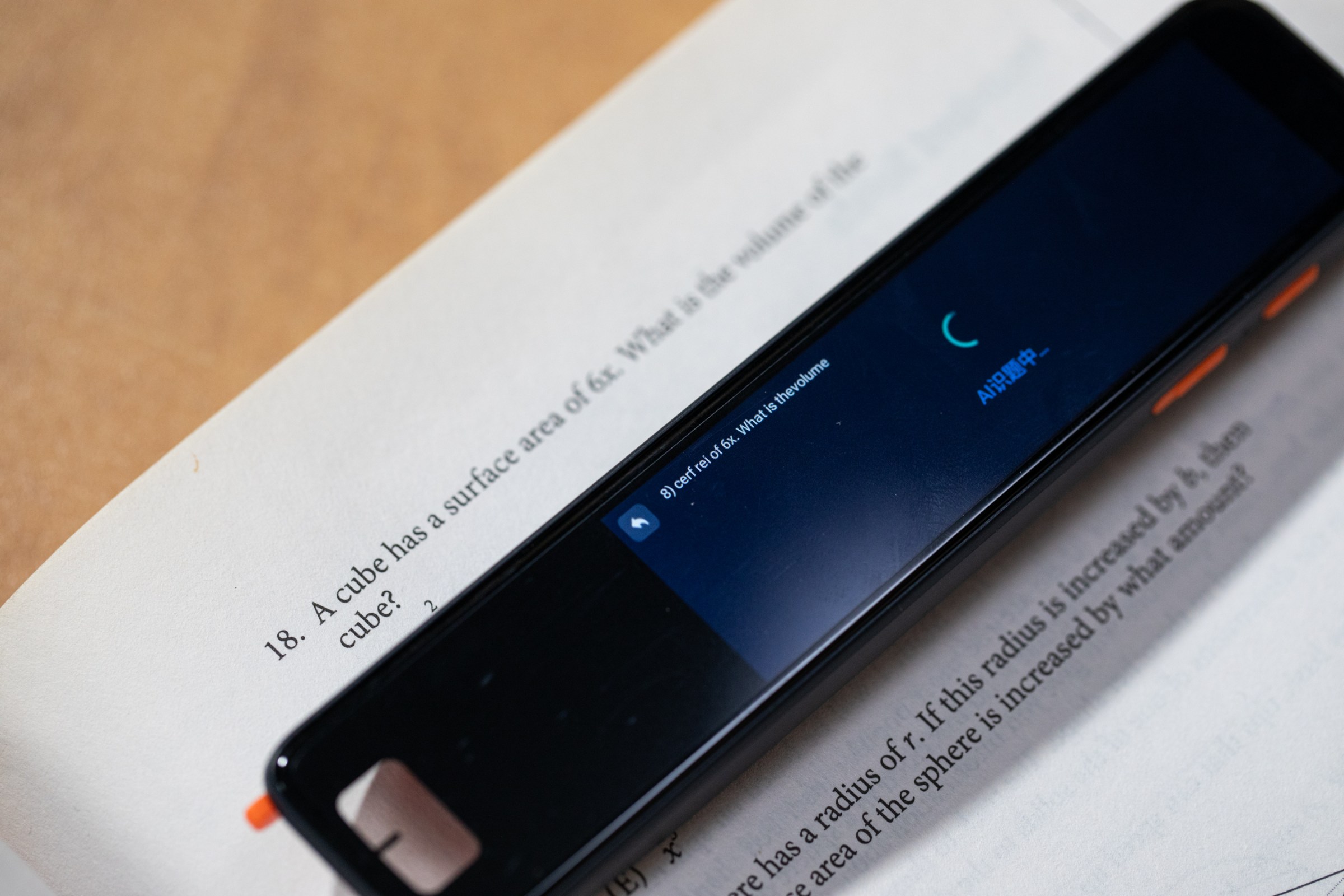 In practice, the gadget is a text scanner. It “reads” the letters on the page using a small camera tucked between two prongs protruding at one end, which turn on a light when depressed against a page. The on-device computer processes the words and uses AI or maybe the internet to churn out an answer.