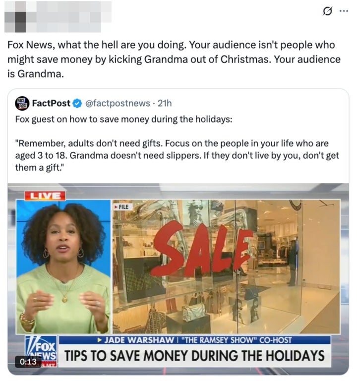 “Fox News, what the hell are you doing. Your audience isn’t people who might save money by kicking Grandma out of Christmas. Your audience is Grandma.”