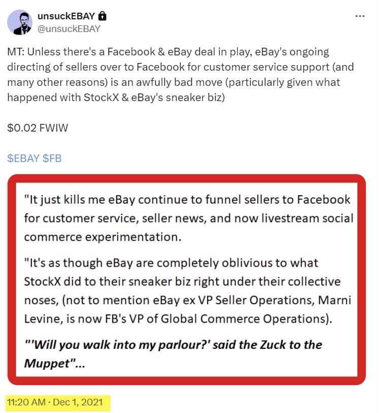 For example, As @unsuckEBAY so presciently explained in 2021, continuing to funnel users to Facebook for support, engagement and live shopping seemed like a bad move, especially in light of how StockX took a big bite out of eBay’s sneaker business in 2019.