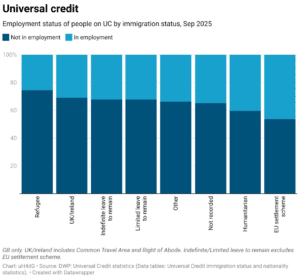In fact, those with status under the EUSS are the foreign national group most likely to be both in work and claiming UC (see fig 2). This suggests – and our research supports this – that many EU citizens are in low paid work in the UK and are using UC to top up their pay. The pandemic showed us that many of the industries where these EU nationals work are essential– for example care workers or those working on farms and in factories. If this group were unable to ‘top-up’ their low paid work with UC, it is unlikely they would be able to remain in these jobs long-term. These jobs are shunned by British workers, but they do ensure cheap food, albeit subsidised by the taxpayer.