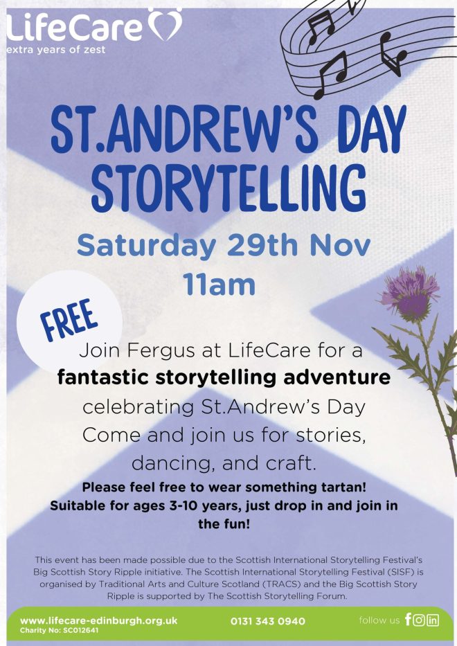 LifeCare is delighted to host a special St Andrew’s Day storytelling celebration led by storyteller Fergus. Families are invited to drop in for a fun-filled morning of stories, dancing, and crafts—perfect for children aged 3–10.