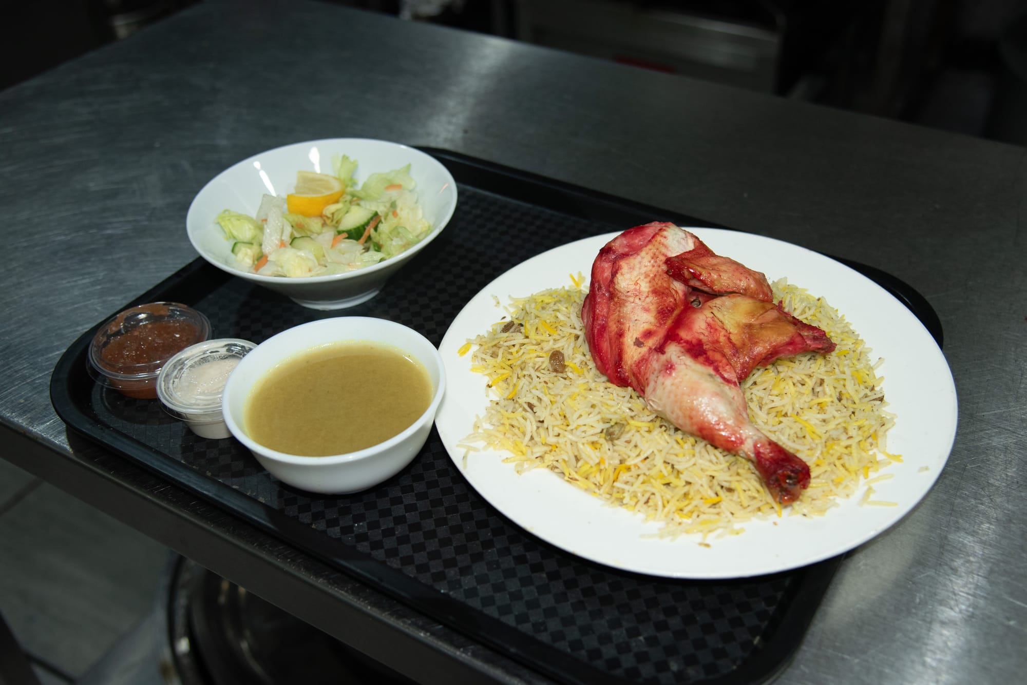 It’s Tuesday morning, and the workers at Zurbiany are tidying the kitchen, legs of lamb and chicken slow cooking on the hob. The TV is providing ambient background noise, an Arabic-language news channel flickering between shots of a lush green farm and a newsroom. I’m sitting at a table texting a friend when Abdullah Al Hasmi, a chef originally from Aden in South Yemen, brings over a plate of zurbian, a tender lamb and rice dish cooked in saffron. There’s a bowl of spicy zhug sauce to season too, and maraq: soup made from lamb and chicken broth. It’s all delicious.