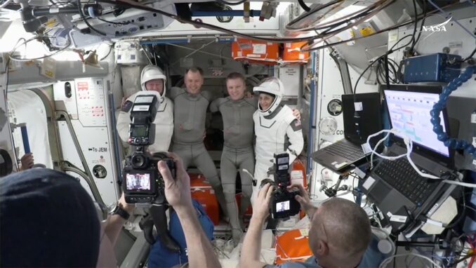The four members of Crew-9 pose for a picture before entering the Dragon spacecraft for their departure. From left to right: NASA astronauts, Butch Wilmore, Nick Hague, Roscosmos cosmonaut Aleksandr Gorbunov and NASA astronaut Suni Williams. Image: NASA via livestream