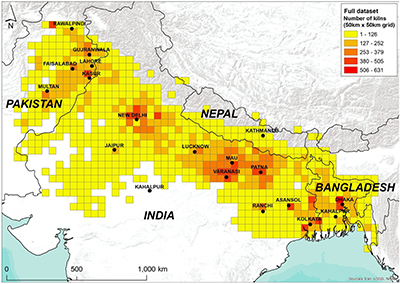 The first rigorous mapping of all Bull’s Trench brick kilns across the 1.5 million km2 ‘Brick Belt’ region, presented as density (number of kilns per 50 × 50 km square). In total the research team identified and mapped 66,455 kilns from satellite data.