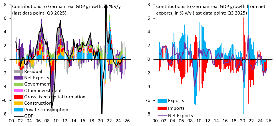 The left chart above decomposes year-over-year GDP growth (black line) into its underlying drivers. Russia’s invasion of Ukraine took a severe toll on Germany and a lot of that shock is still making its way through the economy. But this chart – which is making the rounds – tends to overstate the negative, because the negative drag from net exports (purple bars) isn’t actually about exports, but recovering imports. The right chart decomposes the purple bars in the left chart into the contribution from exports (blue bars) and imports (red bars). The contribution from exports in Q3 ‘25 is flat for the first time in many quarters, so it’s a rebound in imports that’s driving the overall negative contribution to GDP from net exports.