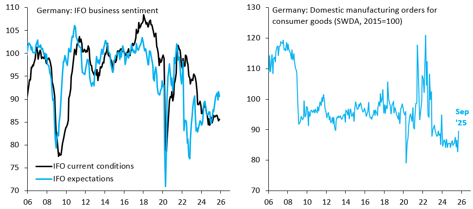 Germany is certainly not out of the woods yet. But markets are putting way too much emphasis on structural drivers and ignoring that cyclical forces have also weighed on growth. That cyclical drag is starting to fade. There’s a clear improvement in business sentiment, especially in forward-looking components, as the left chart above shows. It also looks like domestic manufacturing orders for consumer goods have bottomed, as the right chart above shows. These are just two examples from a growing array of data that suggest that Germany is starting to find its feet.