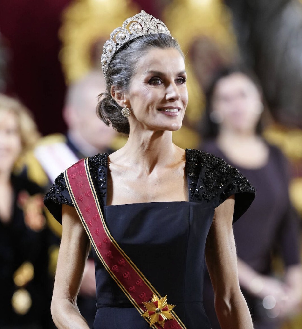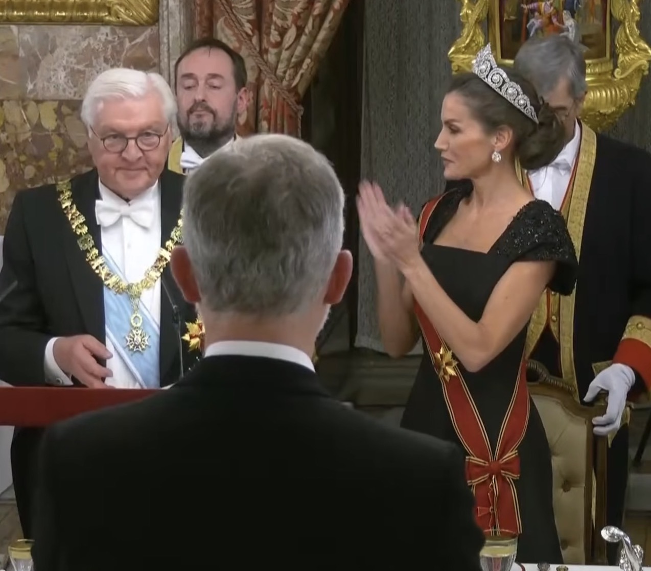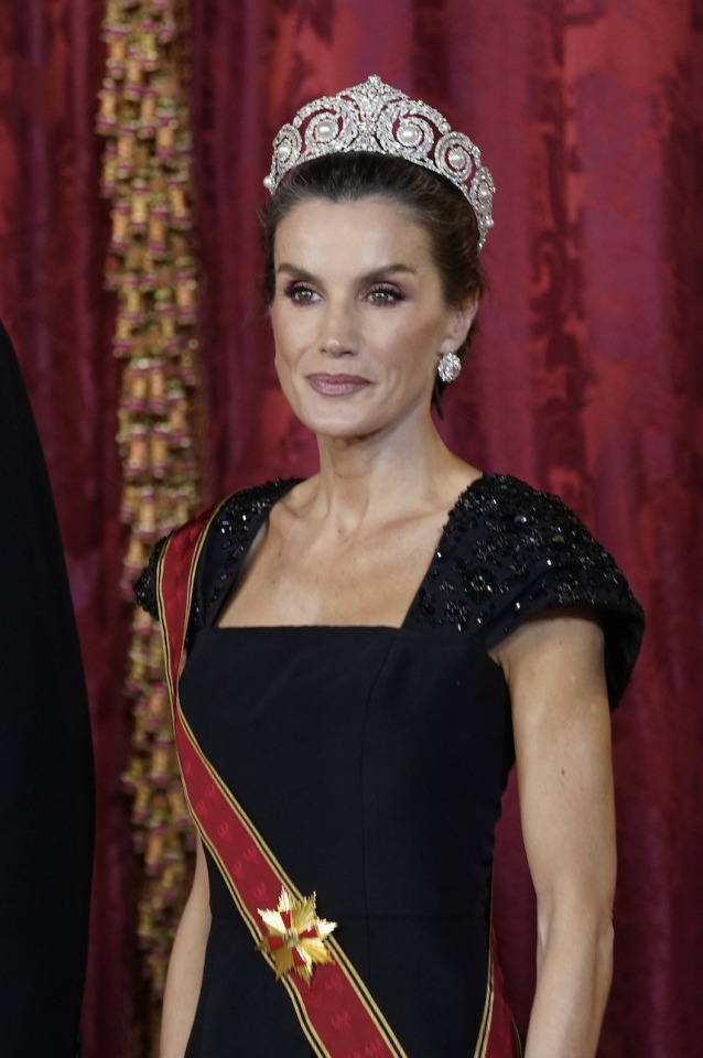 Queen Letizia is wearing Queen Victoria Eugenie’s Cartier Pearl Tiara and Diamond Earrings with the Order of Merit of the Federal Republic of Germany.