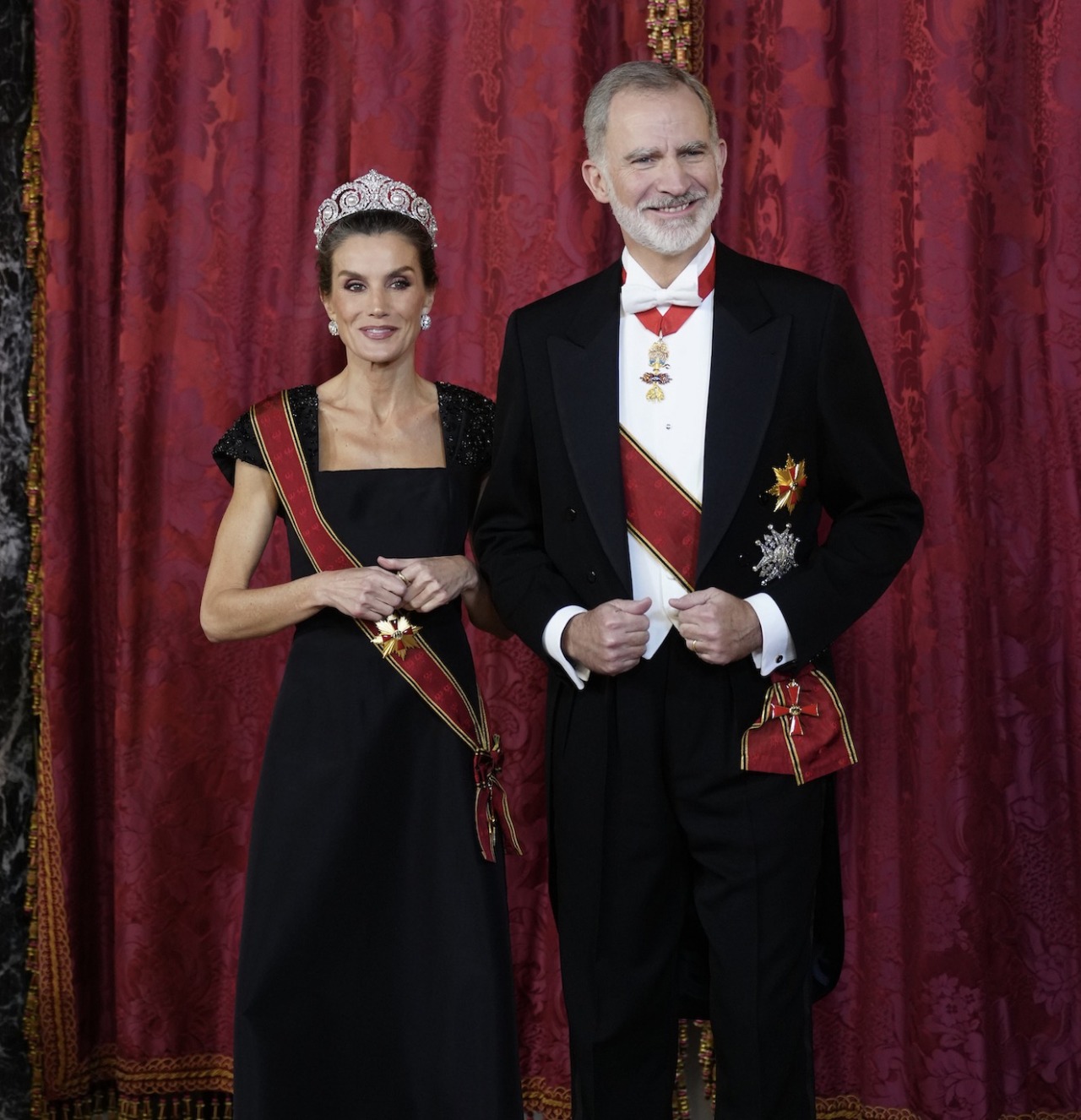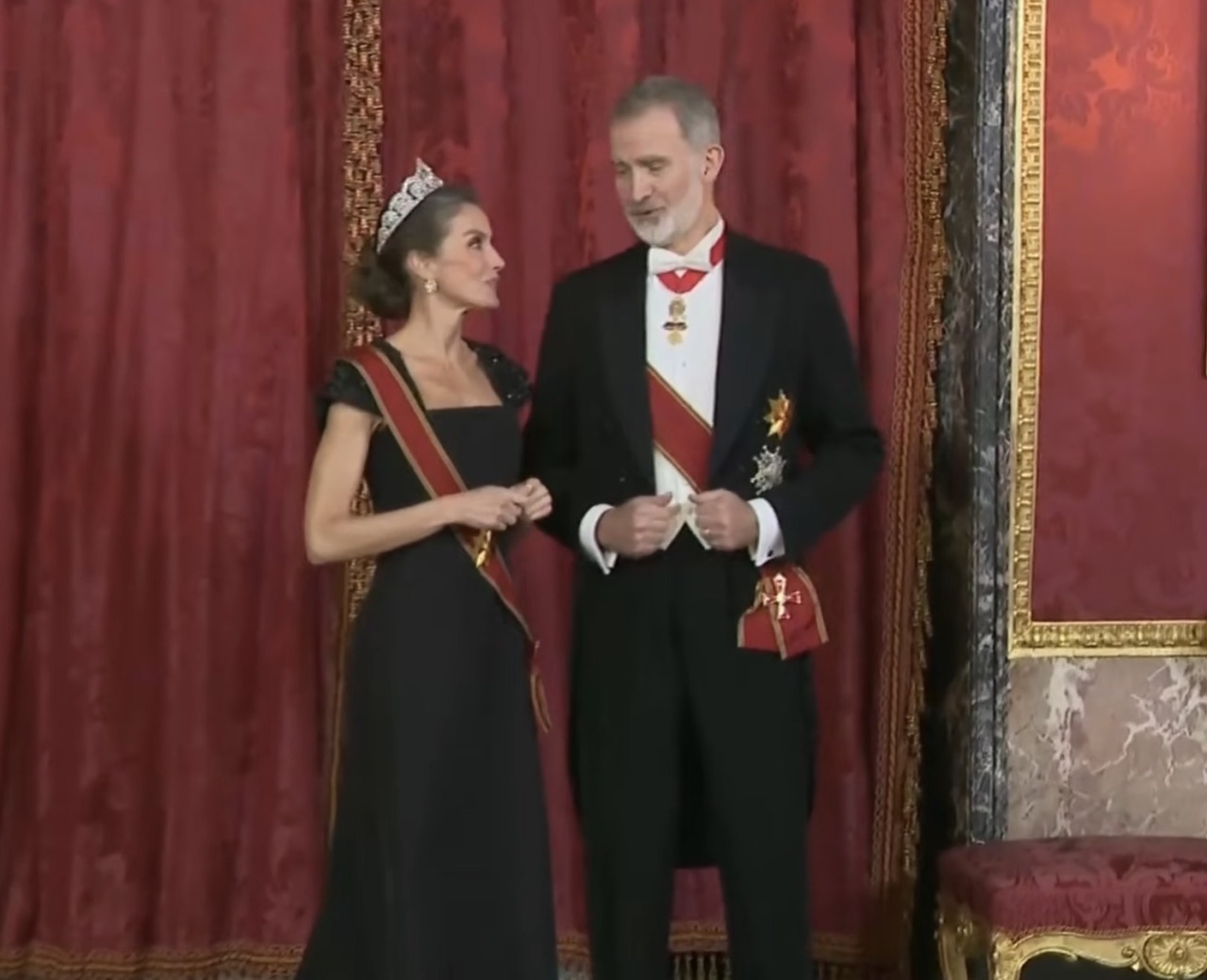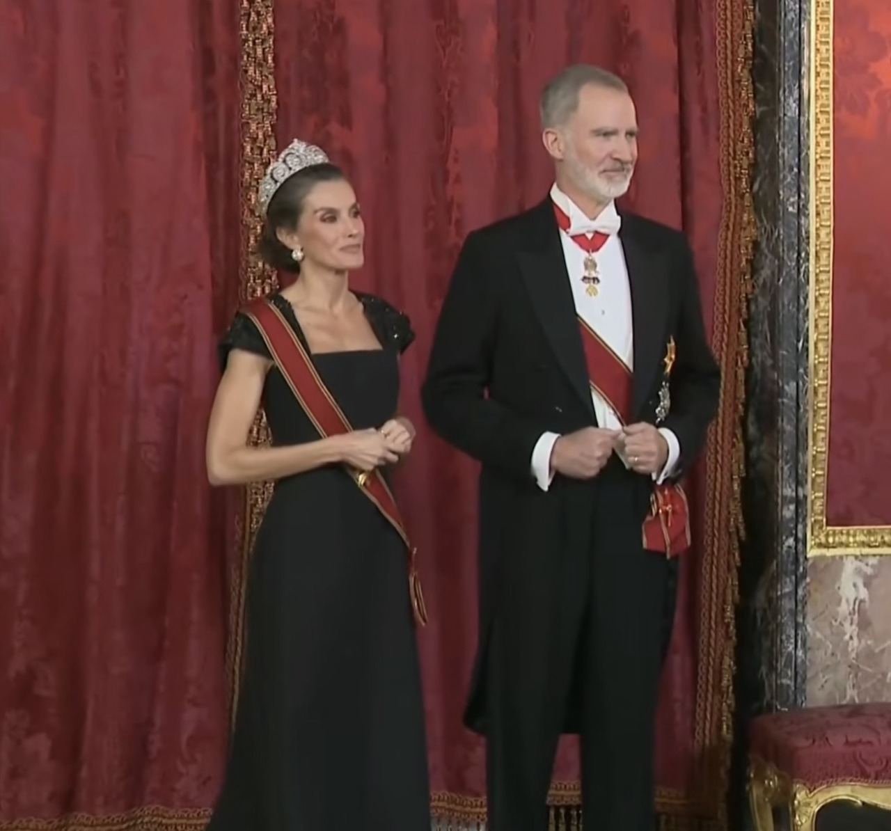 Queen Letizia is wearing Queen Victoria Eugenie’s Cartier Pearl Tiara and Diamond Earrings with the Order of Merit of the Federal Republic of Germany.