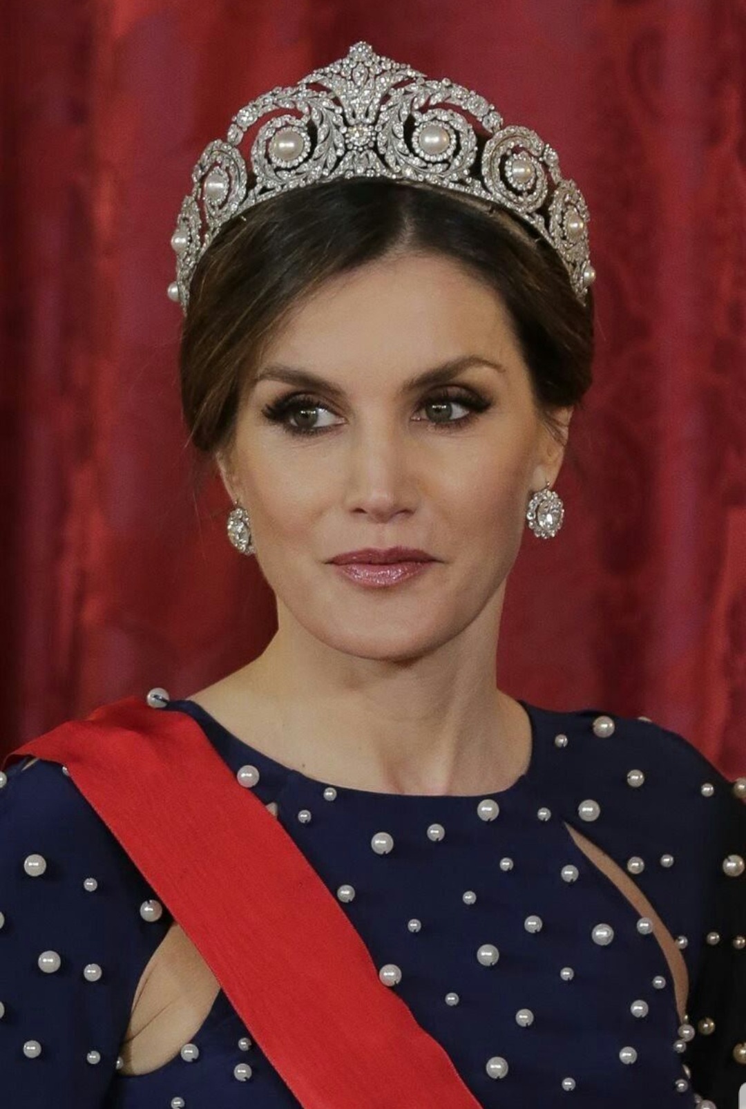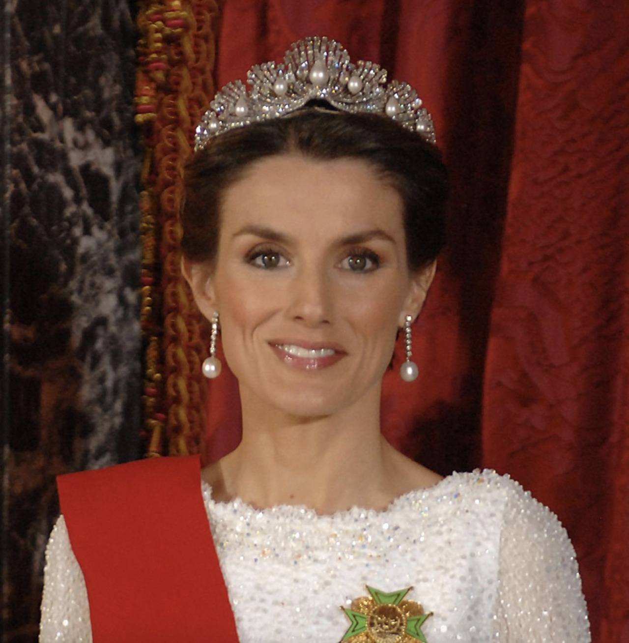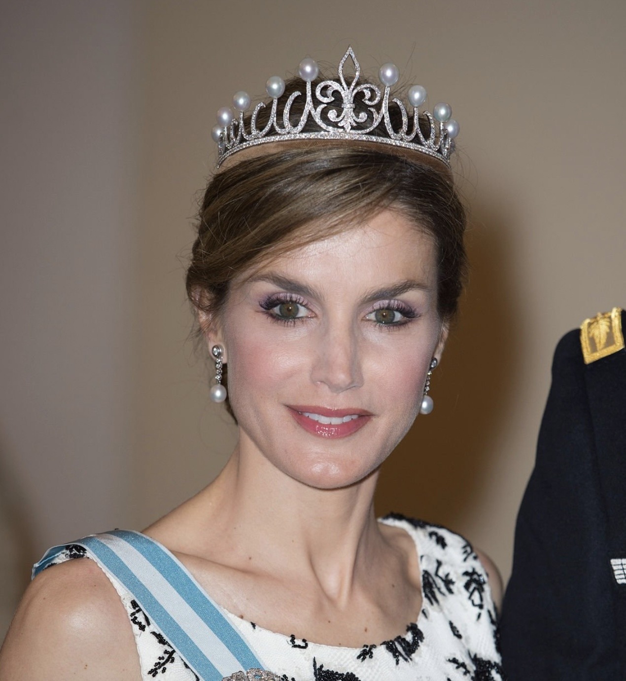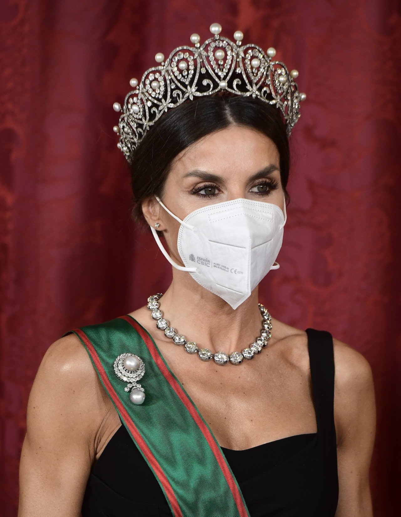 Queen Letizia is wearing Queen Victoria Eugenie’s Cartier Pearl Tiara and Diamond Earrings with the Order of Merit of the Federal Republic of Germany.