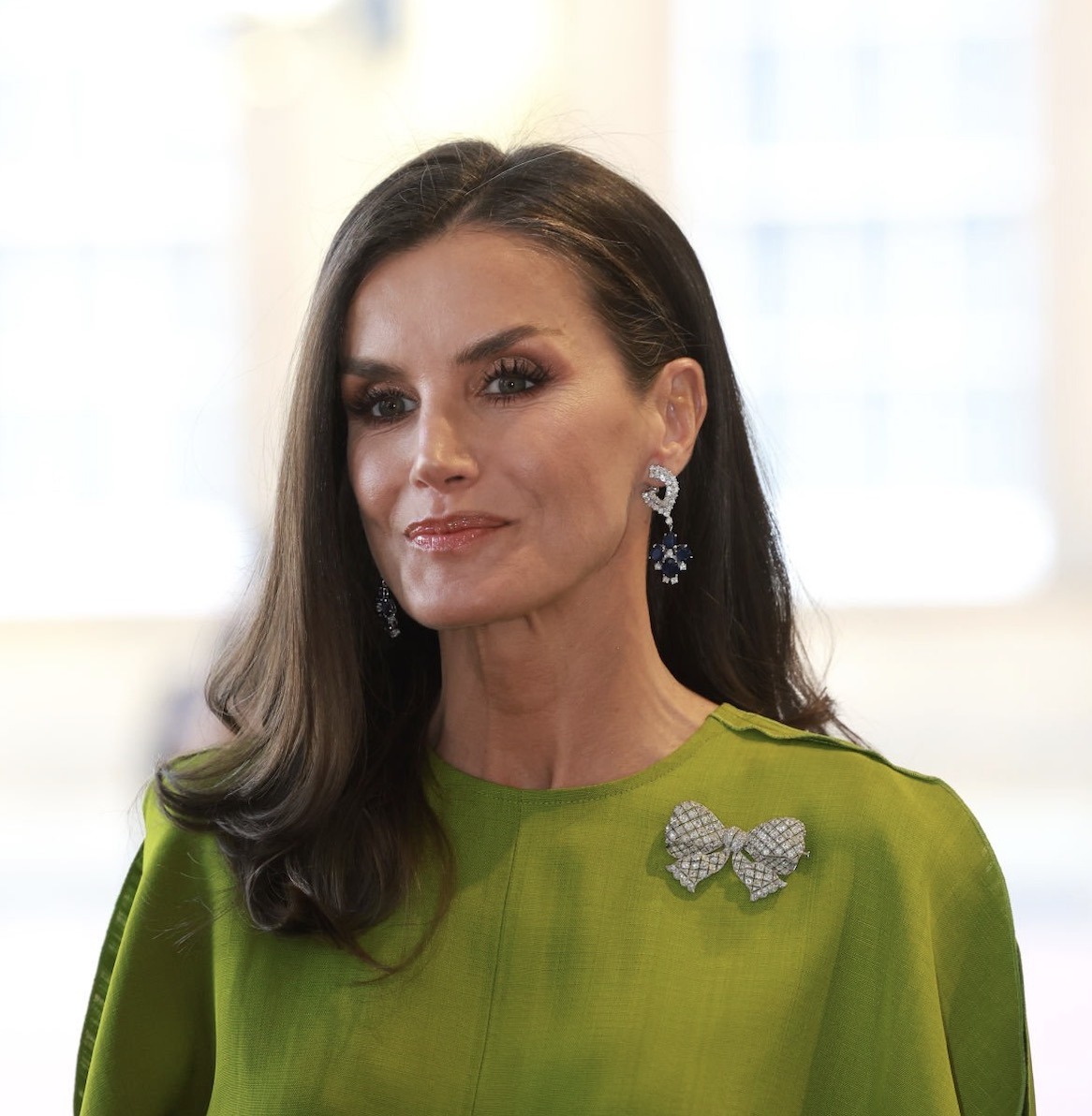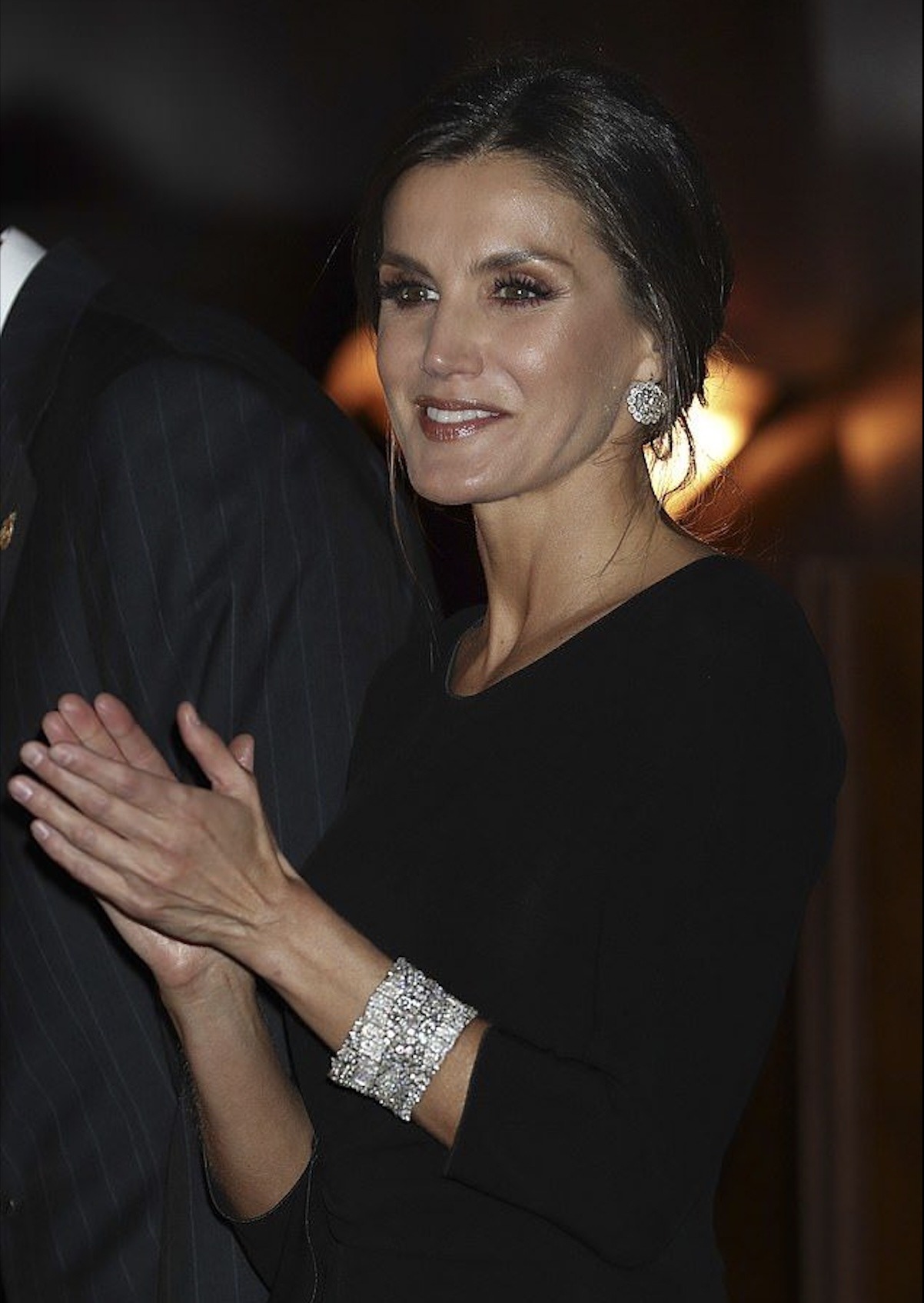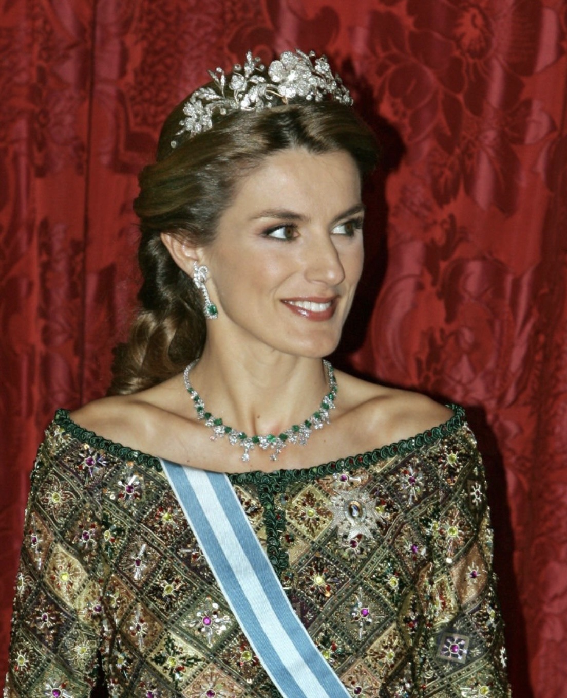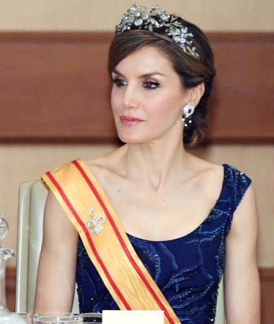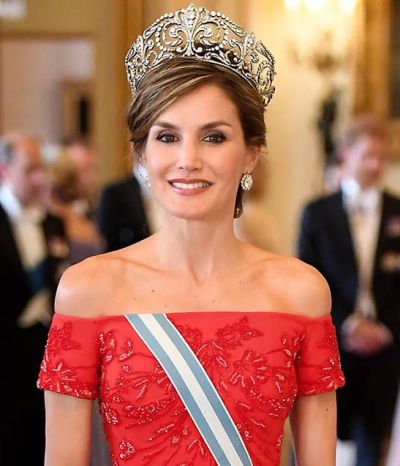 Queen Letizia is wearing Queen Victoria Eugenie’s Cartier Pearl Tiara and Diamond Earrings with the Order of Merit of the Federal Republic of Germany.