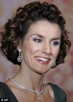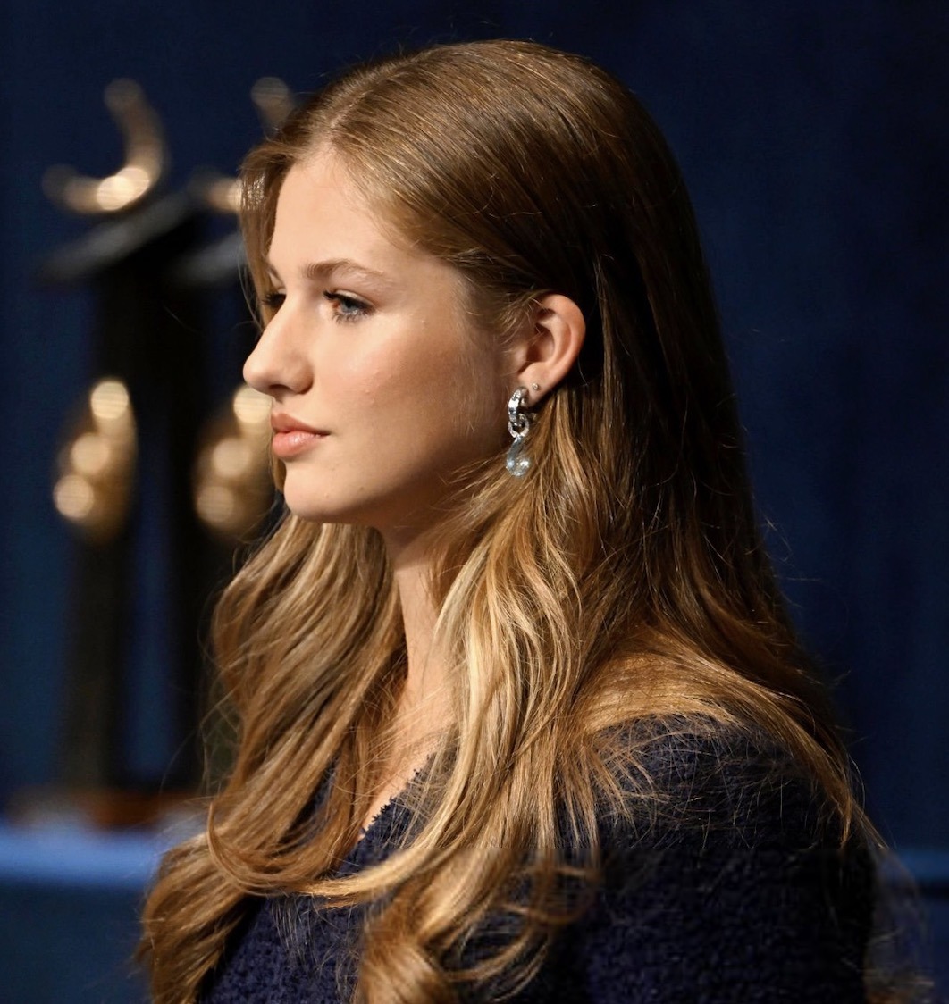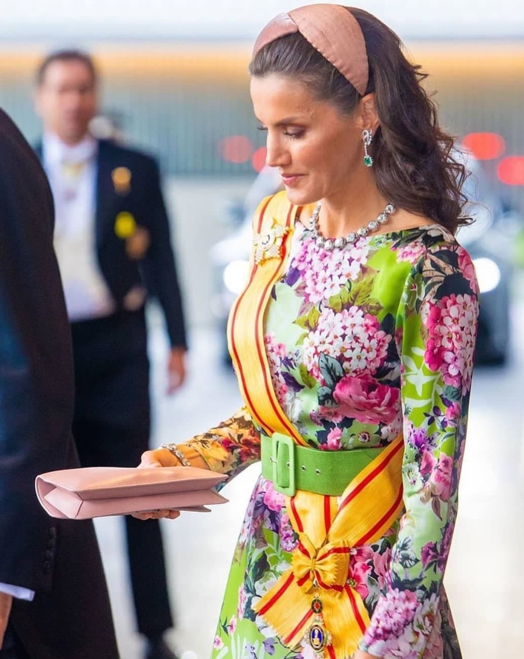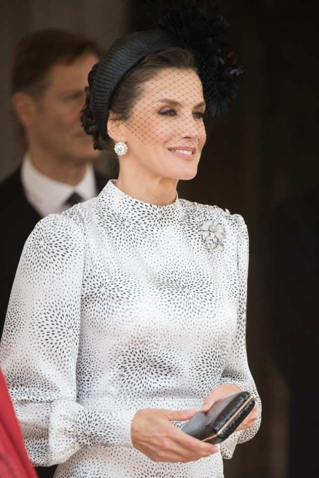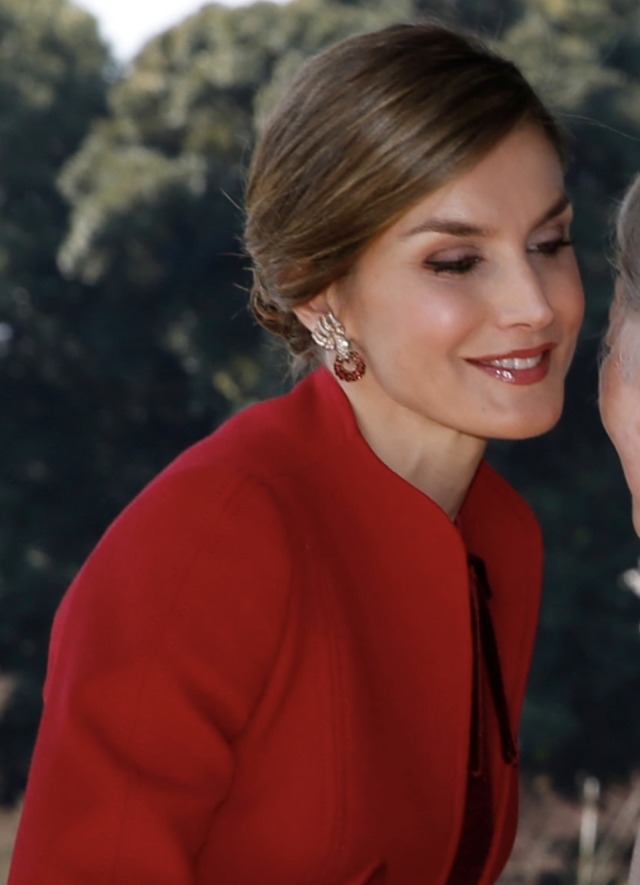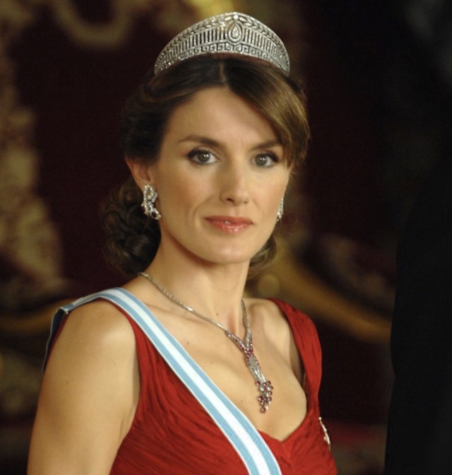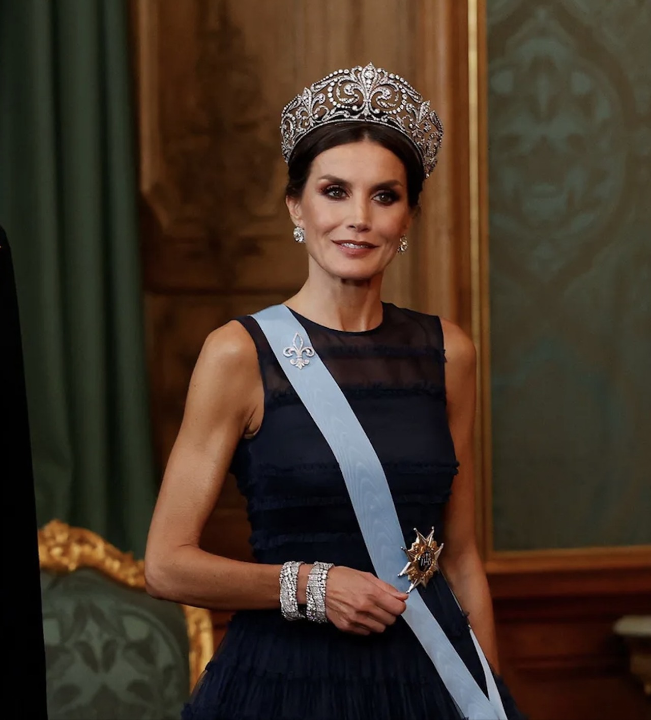 Queen Letizia is wearing Queen Victoria Eugenie’s Cartier Pearl Tiara and Diamond Earrings with the Order of Merit of the Federal Republic of Germany.