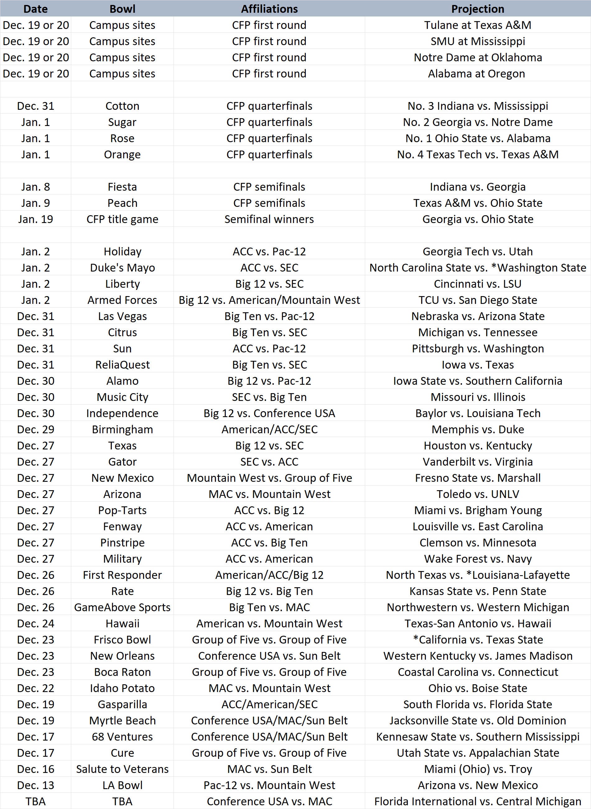 Notes: Not all conferences will fulfill their bowl allotment. An asterisk represents a replacement pick. Legacy Pac-12 schools in other conferences will fulfill existing Pac-12 bowl agreements through the 2025 season.
