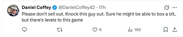 ‘Please don’t sell out. Knock this guy out. Sure he might be able to box a bit, but there’s levels to this game,’ one wrote.