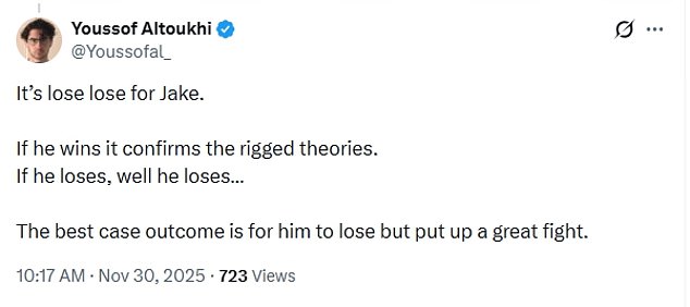 While one more posted: ‘It’s lose lose for Jake. If he wins it confirms the rigged theories. If he loses, well he loses. The best case scenario is for him to lose but put up a great fight.’