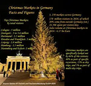 Back to Germany, the craze for Christmas markets are showed in data comparing year 2024 to year 2017. The 170-million-market visits in 2024 represent a 10-million-person or 6% increase, reflecting continued visitor enthusiasm even amid inflation and geopolitical uncertainty.