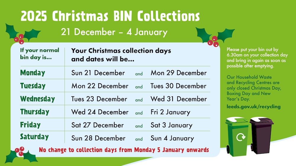 All households are being sent flyers from today and encouraged to be aware of when their collections days will be over the festive holidays. Details can also be seen at www.leeds.gov.uk/bins-and-recycling/check-your-bin-day, on the Leeds Bins app where collection-day reminders can be sent to users’ phones, and via the council’s social media messaging.