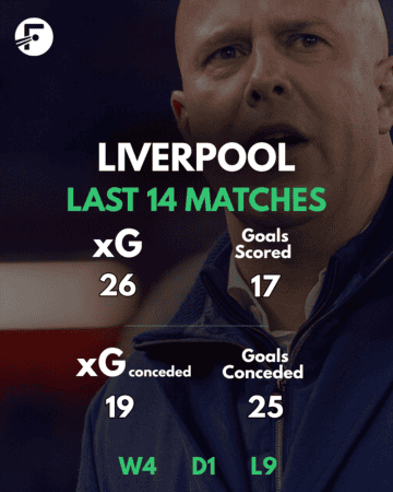 Combine this with conceding 25 goals from an xG of 19.12, and you get a Liverpool team that are frustrated and Arne Slot struggling to explain his side’s drop-off.