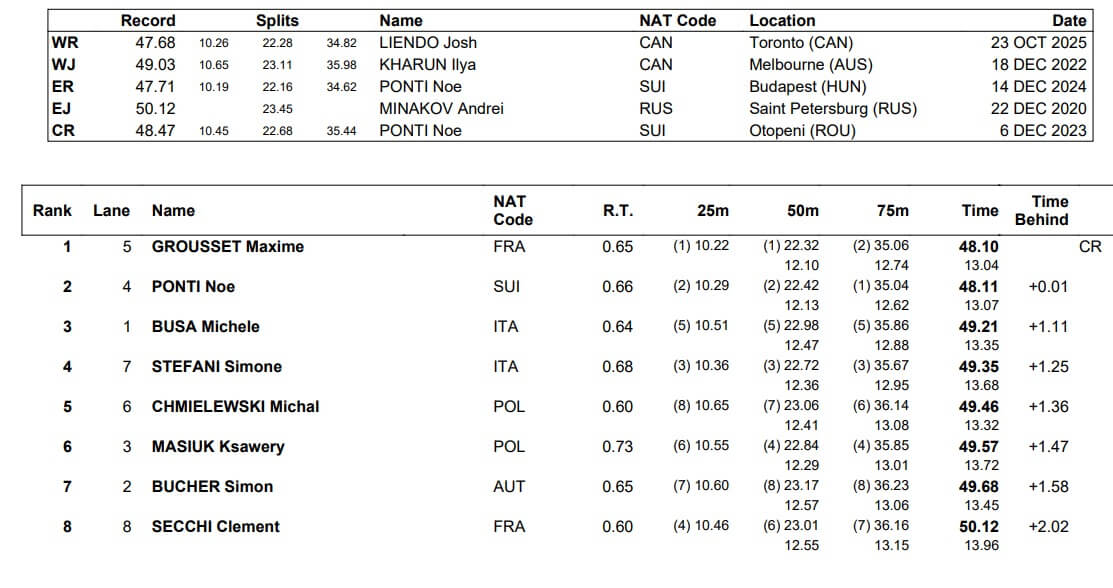 France’s Maxime Grousset won the men’s event in 48.19. He led after the 50, fell behind at the 75 but surged to the wall just ahead of Switzerland’s Noe Ponti (48.11).