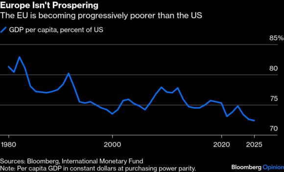 Photograph: Flags of the European Union (EU) in front of the Berlaymont Building, which houses the European Commission’s headquarters in Brussels, Belgium, on Wednesday, Nov. 5, 2025; photo credit: Simon Wohlfahrt/Bloomberg