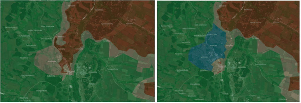 Maps of the situation in Kupiansk on October 19 (left) and December 12 (right), respectively, according to the Ukrainian analytical project DeepState.