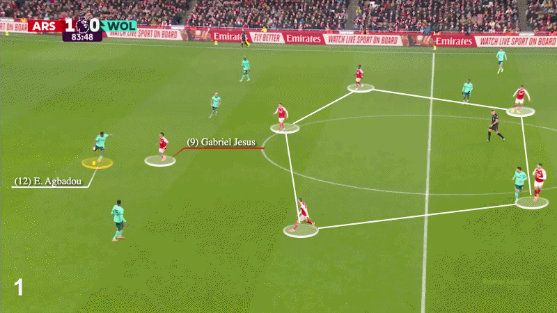 Arsenal’s press was coordinated at that point and led by the substitute Gabriel Jesus, who in the example below, denied the Wolves centre-back Emmanuel Agbadou time on the ball, forcing him into a longer pass that ran through to David Raya.