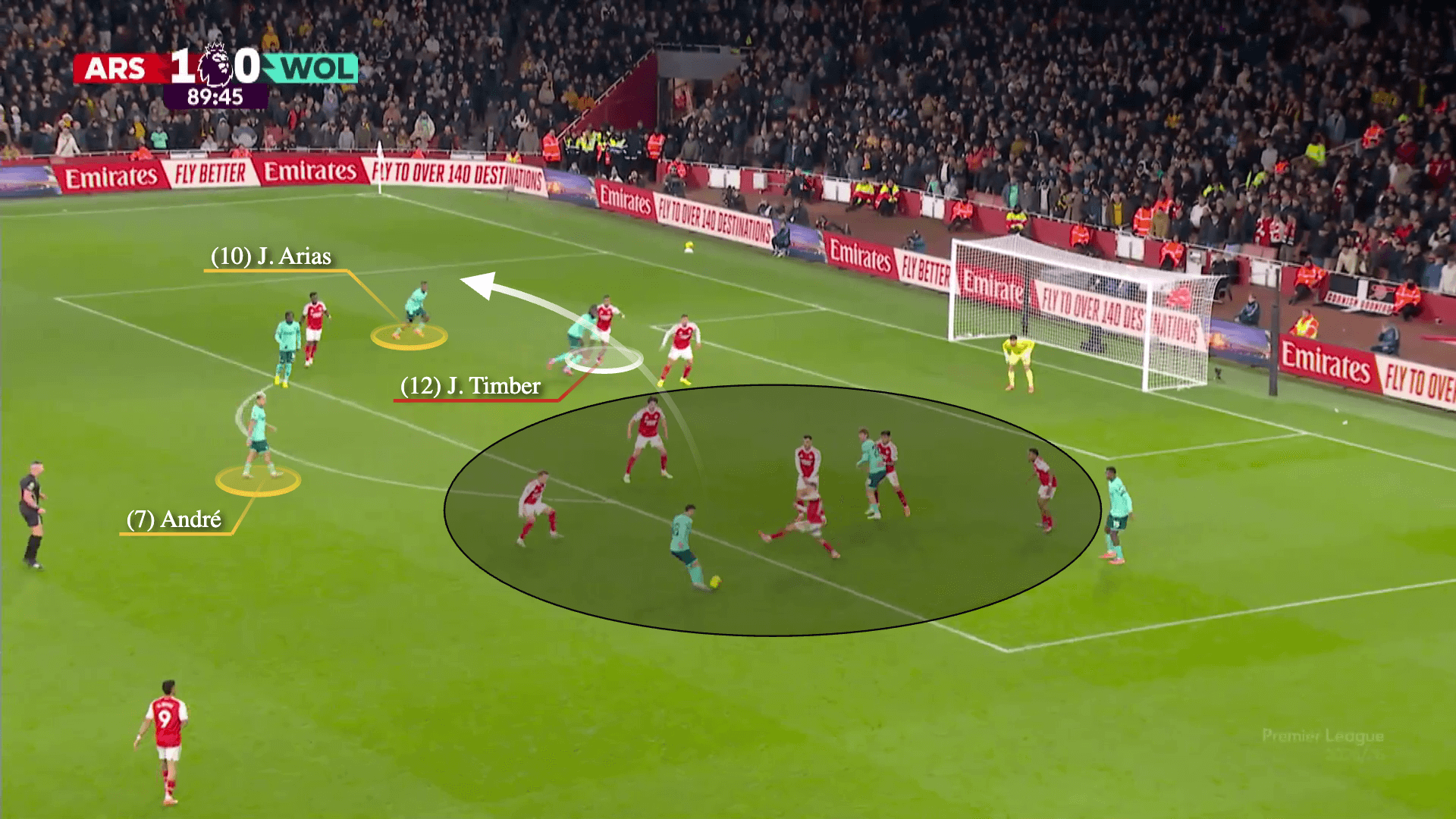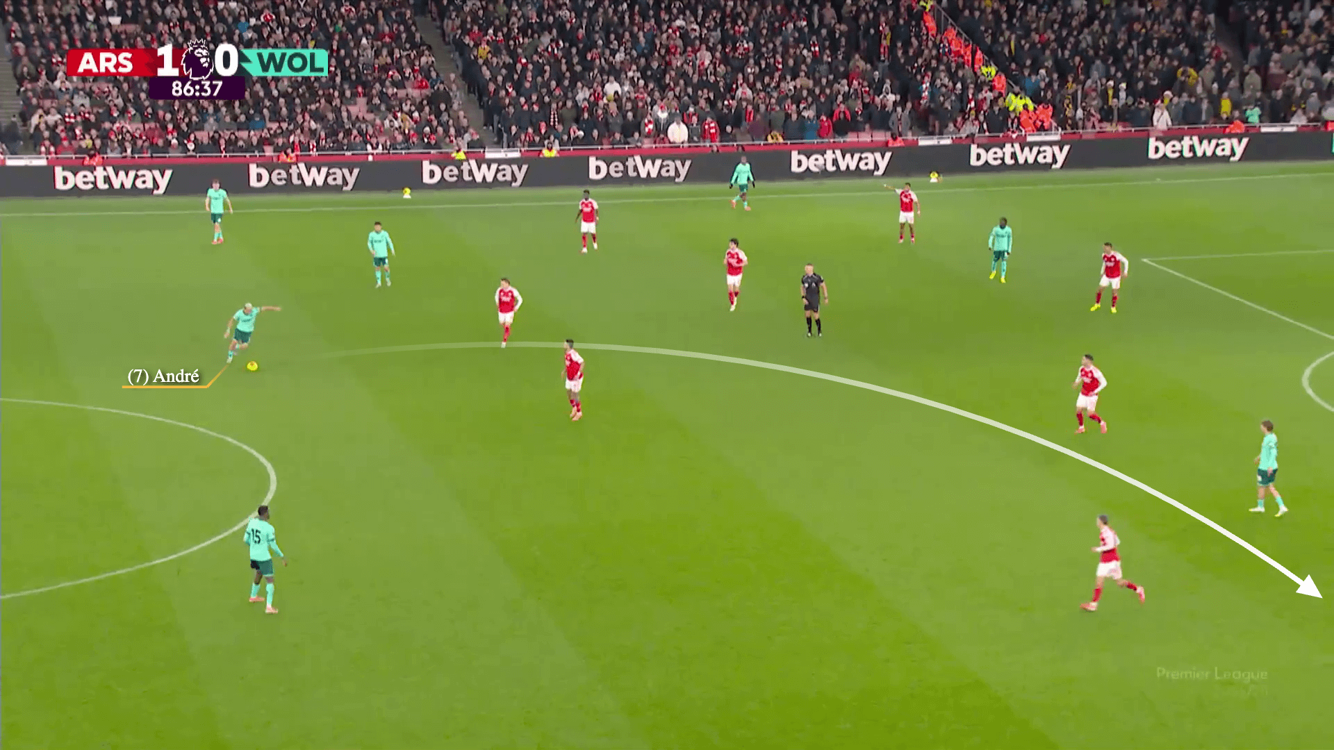 Another Merino clearance and another Wolves attack followed, only this time it yielded a reward. Six Arsenal players ended up being sucked to the ball, leaving them outnumbered at the back post, where Jhon Arias was unmarked to nod the ball down to Mateus Mane.