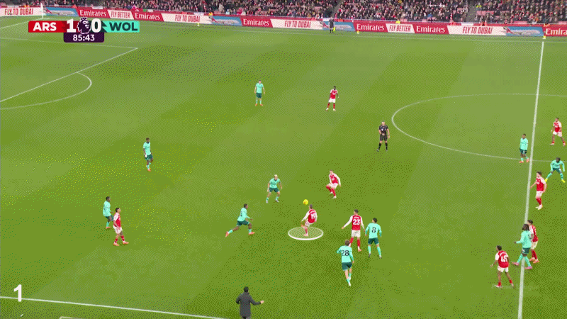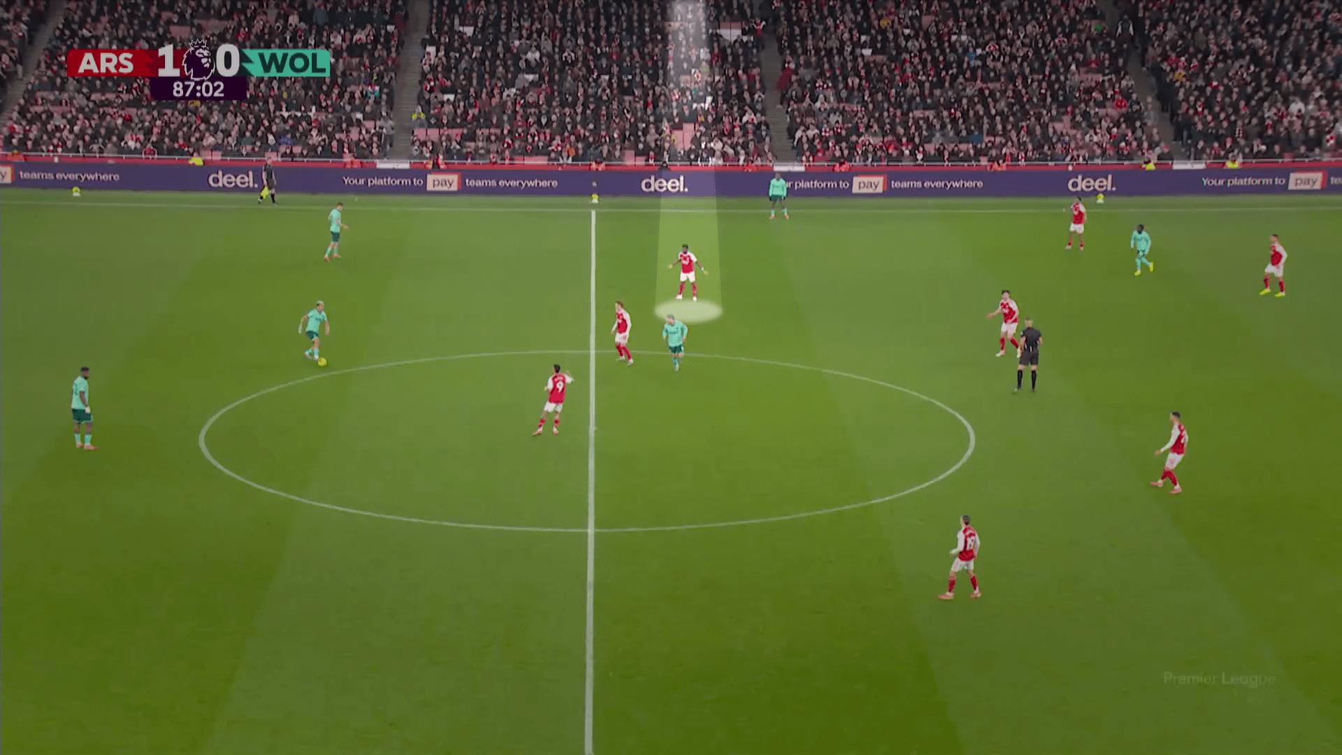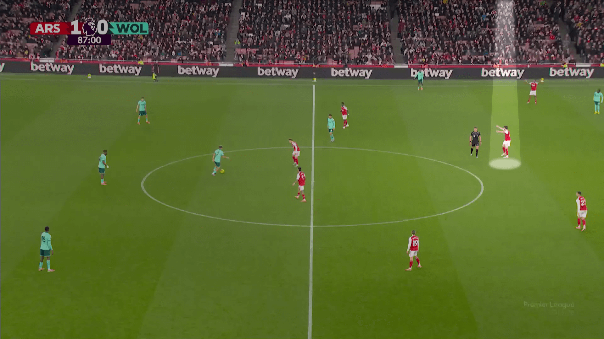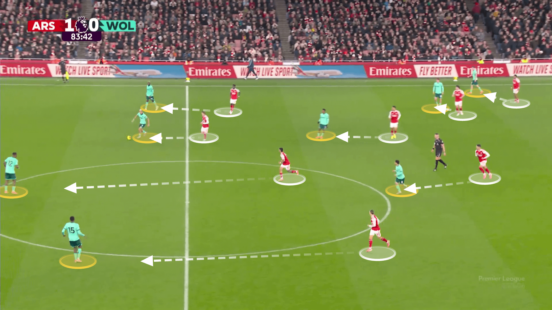 For example, it was far too easy for Wolves to find a way through Arsenal’s mid-block in the clip below, where nobody took responsibility for marking Joao Gomes, despite every Arsenal player being behind the ball, and five of their opponents still in their own half.