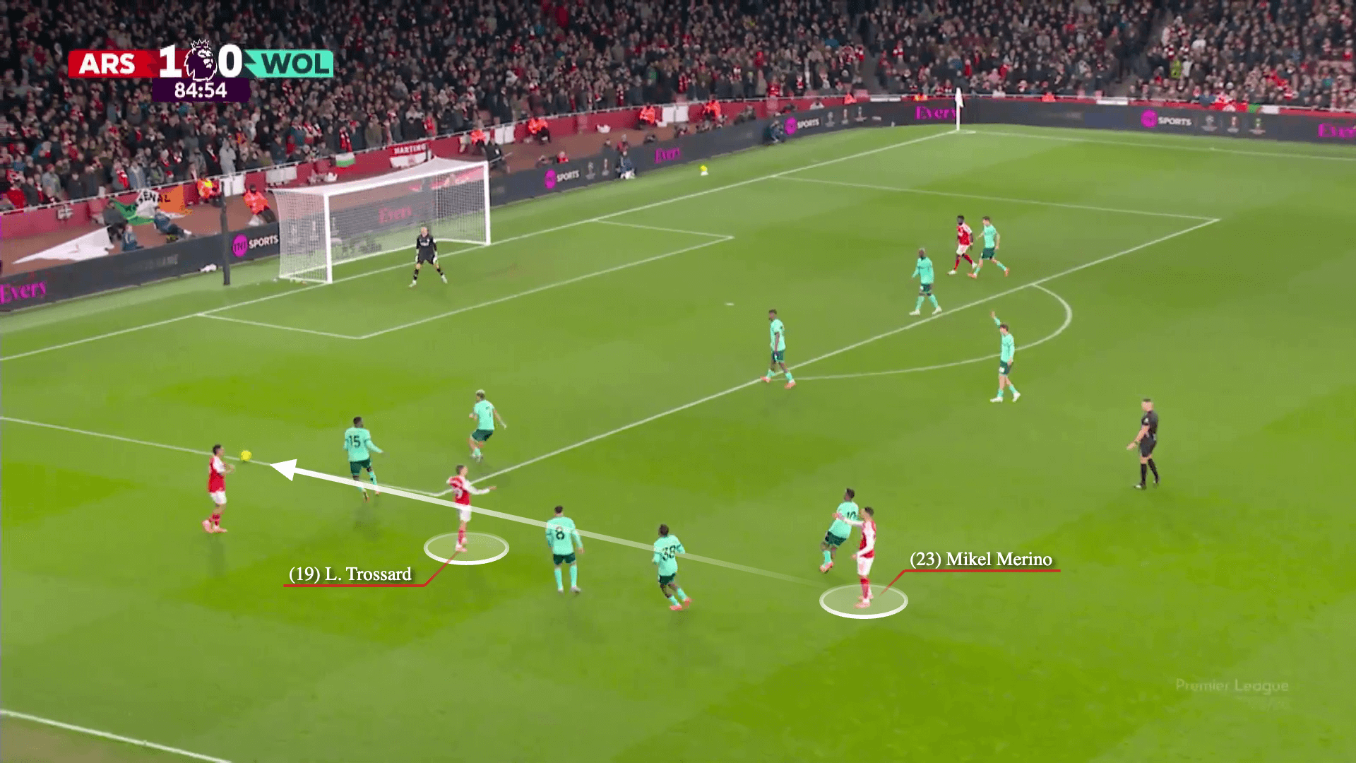 Caught in no man’s land, Merino jumped out to press Gomes but the Wolves midfielder got to the ball first and released Fer Lopez in space. With Arsenal stretched, Jackson Tchatchoua should have done better from a promising position on the right.
