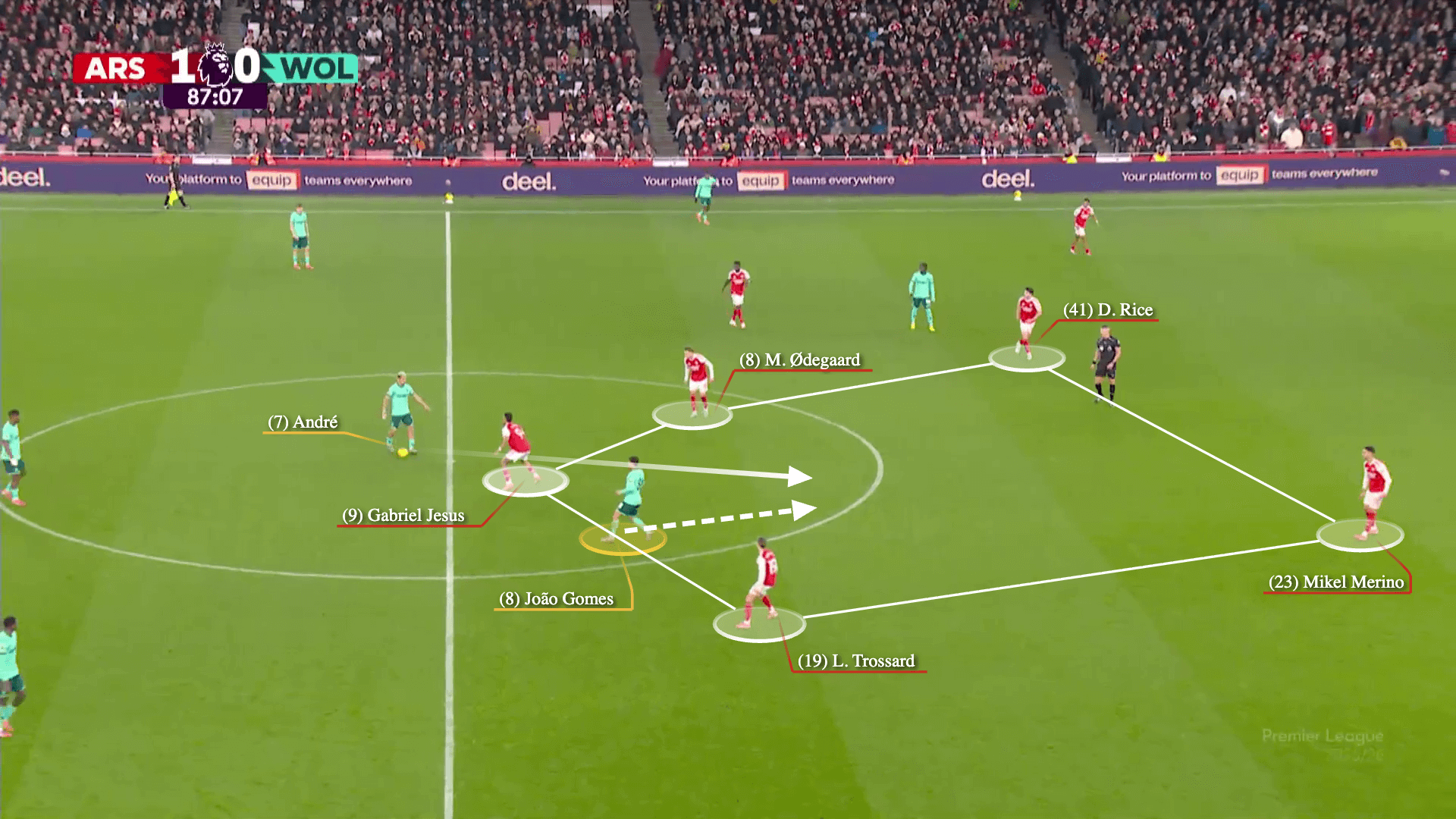 Unlike the earlier clip, Jesus was slow to press and that gave Mosquera time to thread a pass behind the Arsenal striker and into Gomes, who was stationed between Rice and Merino. Gomes then released Lopez — the same combination as a minute before, when Arsenal’s midfield were also marking space — and Tolu Arokodare should have ended up clean through on goal.