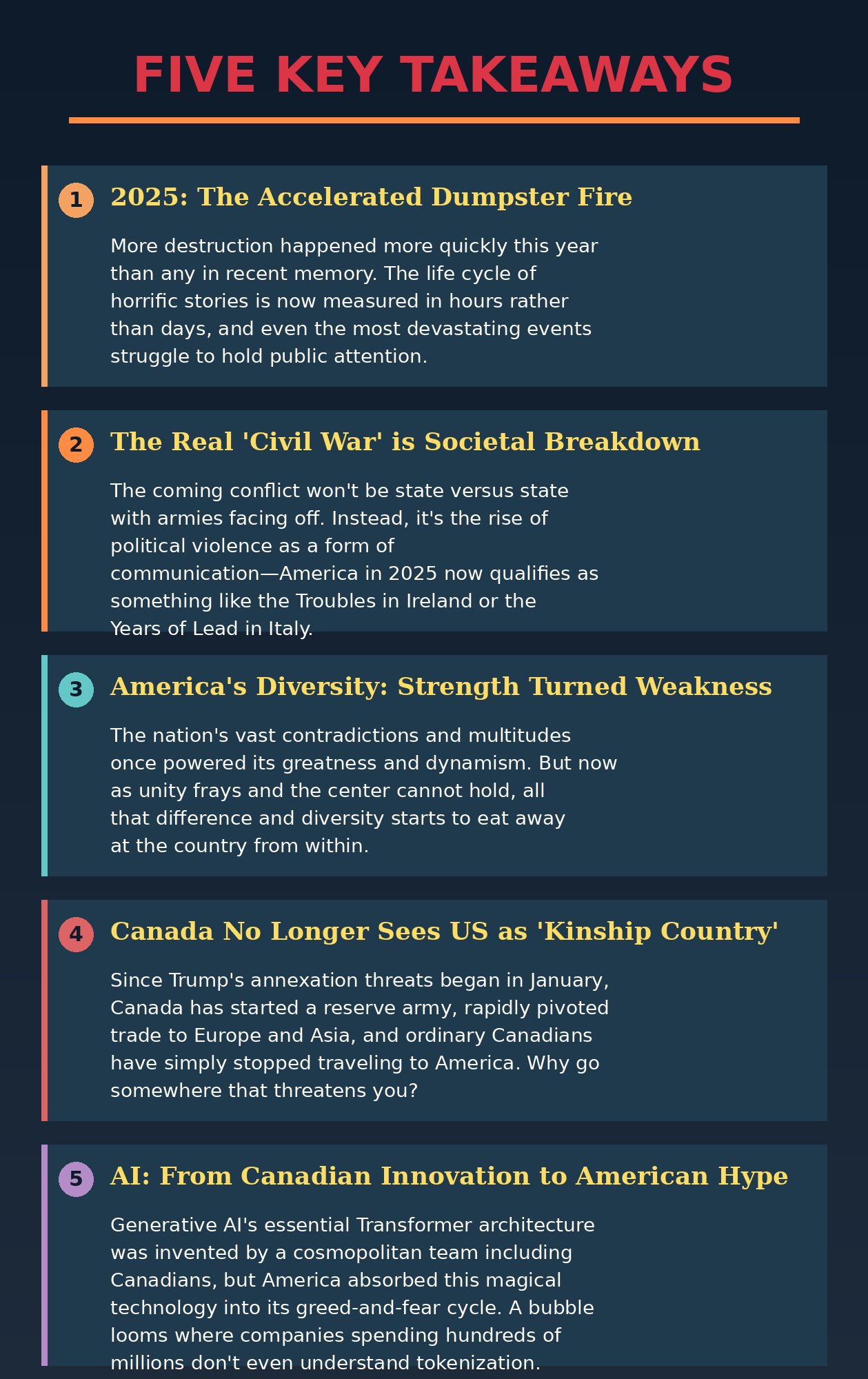 Whither America? For the Canadian writer Stephen Marche, that’s no longer the question. America in 2025, for Marche, has already withered. The Toronto-based author of The Next Civil War argues that the future has already arrived in the United States. And it’s a violent, regressive future – which is only going to get more dismal in 2026. That’s the view from Toronto where Marche is enjoying a front seat on the arrival of the American future.