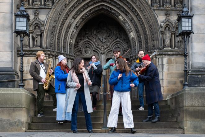 To mark the announcement, members of Tinderbox Orchestra, plus award-winning fiddler and First Footin’ co-curator Aidan O’Rourke and classical pianist and talented singer-songwriter Chiara Lordi, gathered outside St Giles’ yesterday for a pop-up performance, tuning up for their gigs on 1 January.