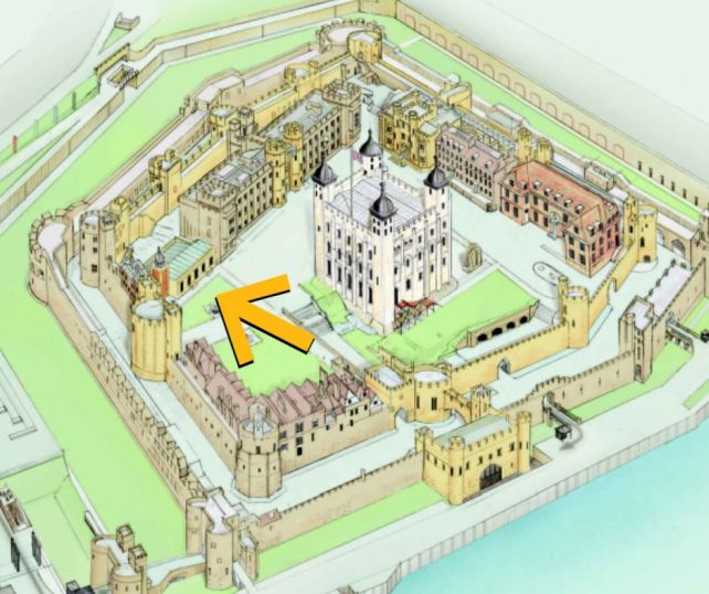 A visitor map of the Tower of London grounds, with a yellow arrow pointing to the location of the Chapel Royal of St Peter ad Vincula. (Historic Royal Palaces)
