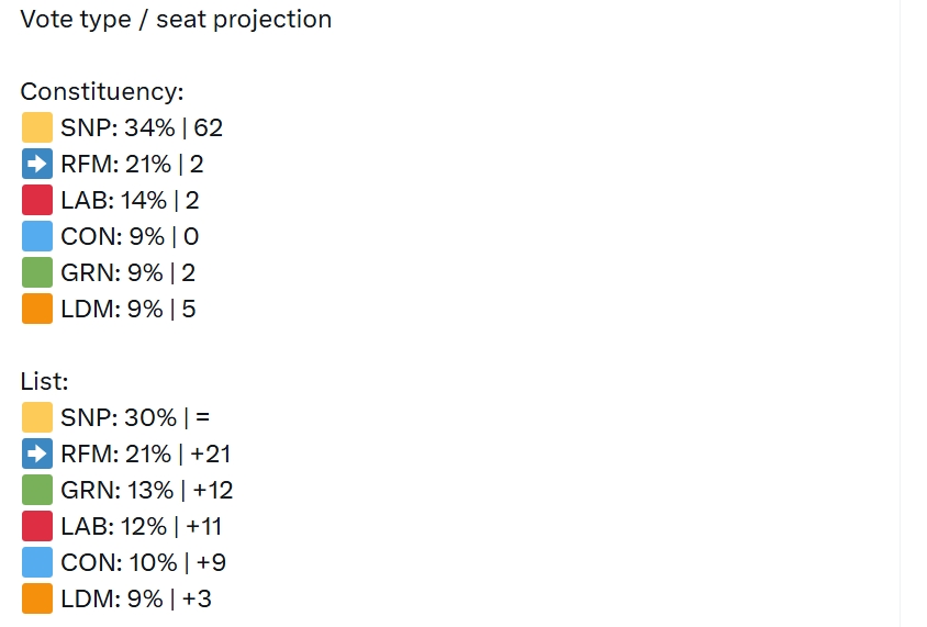 It would result in the following seats: SNP 62, Reform 23, Labour 13, Conservatives 9, Greens 14, and the Lib Dems 8. This would mean annihilation for the Tories, failing to pick up a single constituency and reduced to picking up just nine seats on the list. It puts Scottish Labour and the Conservatives projected to fall into joint fourth place, despite Labour spending lavishly on social media and Anas Sarwar only a couple of days ago being interviewed by the Daily Record and boasting that he’d be First Minister next year. It would, of course, be a breakthrough moment for Reform UK, who would have a batch of MSPs that nobody had ever heard of. We have no idea what any of their polices would be (neither do they).