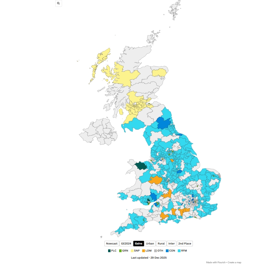 The Westminster polling shows decimation for Labour (-330) and for the Conservatives (-64) and huge gains for the Greens under Polanski (+22) and the SNP (+36). This would be a massive historic breakthrough for a populist left-green party in England. It would also mean that former SNP voters who ‘leant’ Labour their vote in 2024, abandoned them and returned to the SNP.