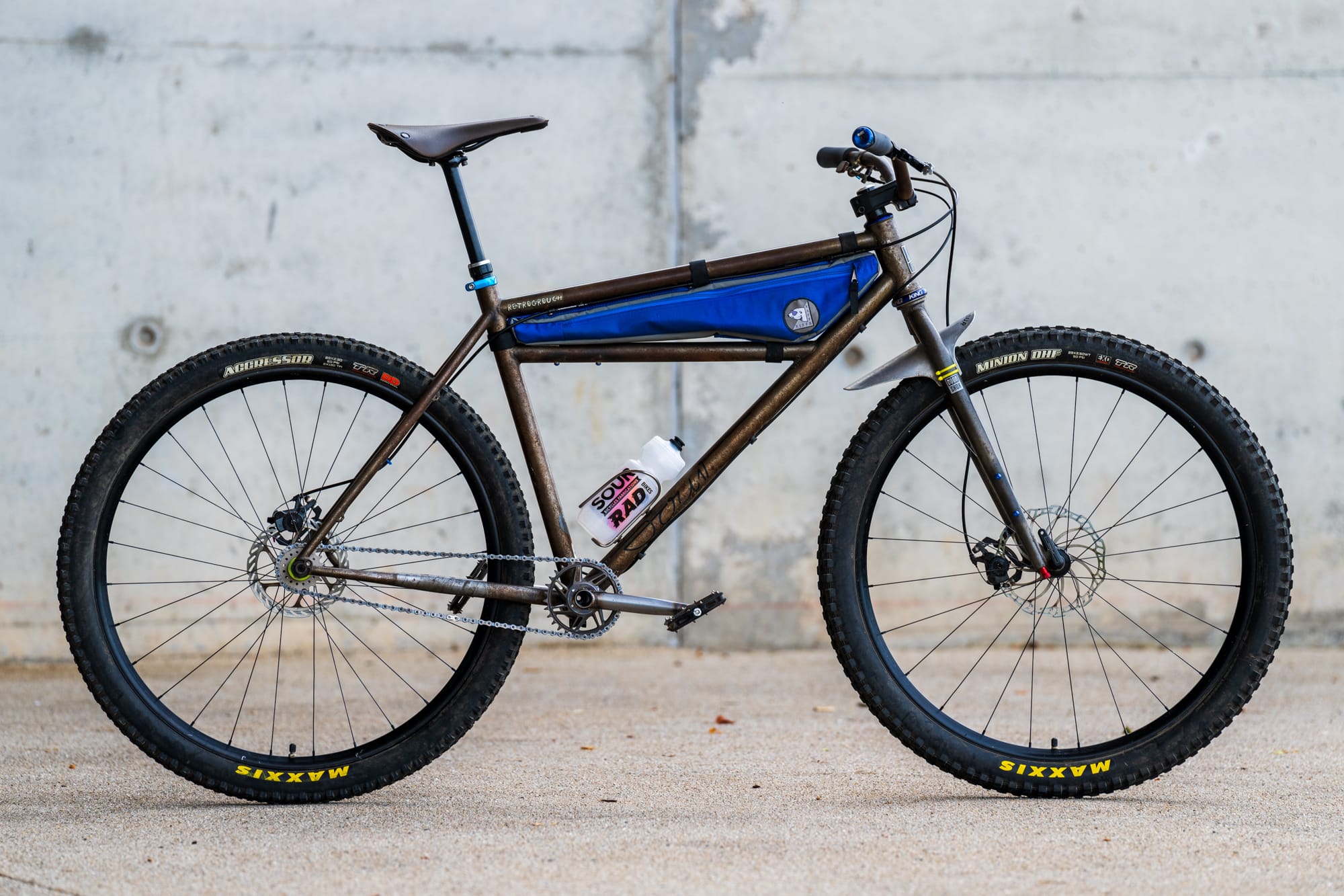Within a show venue next to the likes of Prova, Sturdy, Avalanche, and other squeaky-clean builders, here was this German tinkerer with a linseed oil patina’d steel frame, homemade 860 mm moto-style handlebars, and a cold-rolled front fender. And to top it off, the bike had a brazed steel dropper remote he fabricated from scratch simply because he broke his old one, didn’t have a replacement, yet wanted to ride the next day.