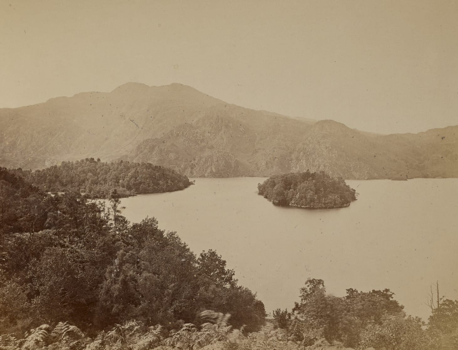 Elevated view of Loch Katrine. Ellen’s Isle and Ben Venue Mountain can be seen in the distance 1877. Photo: Thomas Annan, public domain