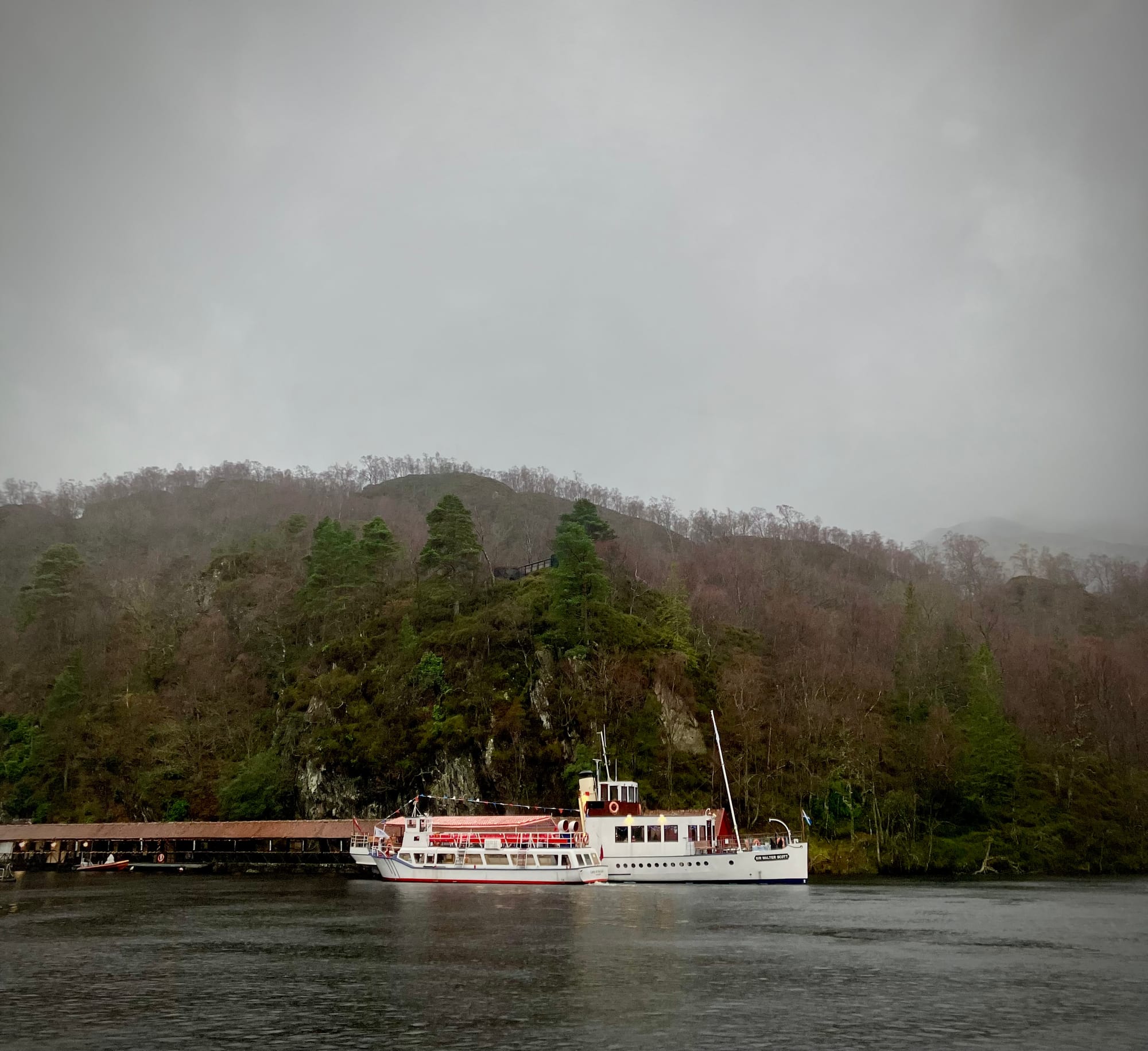 Two small boats, the Rob Roy III and the Lady of the Lake, are tied up alongside the grand Walter Scott steamship, and all three idle their engines at the southern pier, waiting for passengers. The “earlier world” of the 450-million-year-old Arrochar Alps that Scott described surrounding Loch Katrine in ‘The Lady of the Lake’ looms high over the scene, poised to reassert total mountain power after the pleasure boat timetable stops at 3pm.