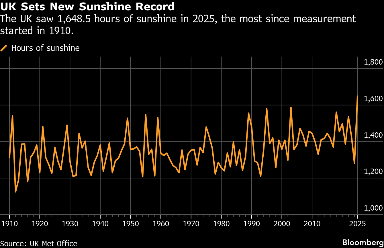 (Bloomberg) — The UK just wrapped the warmest and sunniest year ever recorded.