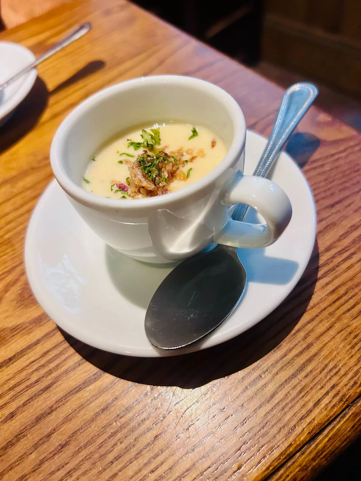 The longing soon subsided though when a tiny cup and saucer arrived at the table – a complimentary appetiser from the chef. A celeriac, honey and mustard concoction resembling soup was delicious – creamy and earthy with a bit of sweetness from the vegetable, a sharp tang from the mustard and floral honey notes.