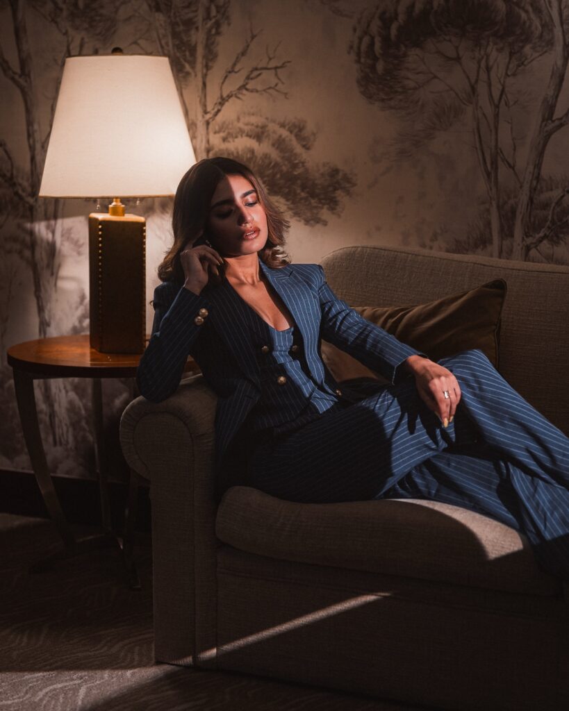 Her latest pictures show a different side of her style. She’s dressed in a pinstriped suit that feels sharp but not stiff. The fit is clean, the neckline dips just enough, and the gold buttons add a nice flash without overdoing it. Her body language keeps it relaxed. Loose hair, soft makeup, an unforced gaze. It feels less like a formal shoot and more like she just stepped into good light and owned it.