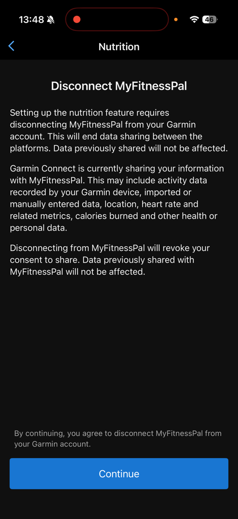 Once you open this up, if you have MyFitnessPal activated, it’ll disconnect that integration entirely. This is notable because it also whacks any workout data sharing with MyFitnessPal. It’s not clear to me if I can re-establish that for only workout data or not, maybe I’ll try later. Also notable is that MyFitnessPal is kinda an old backdoor way to sync other weight scales into Garmin Connect. So this kills that too.