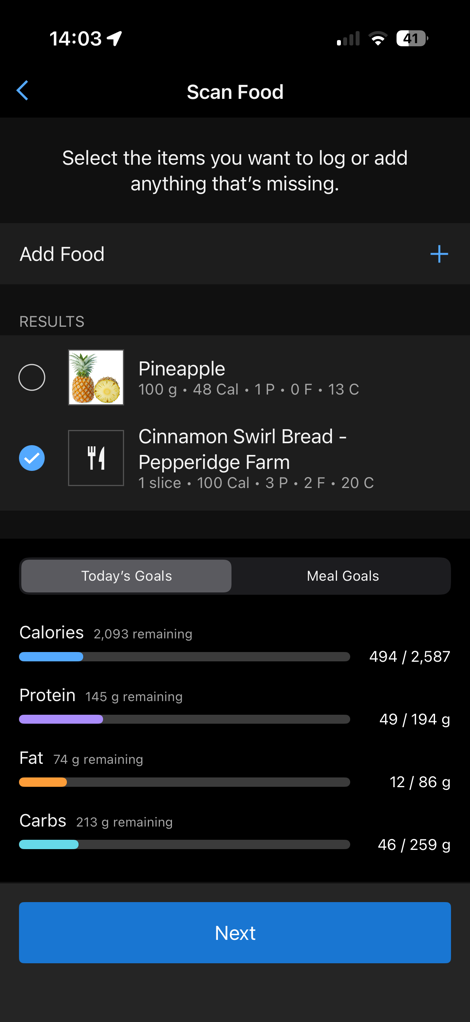 I don’t know if those calories/macros are correct, but they probably are. I checked the weight of the slice I cut, which was slightly higher, but good enough. I thought it was funny that it also grabbed the pineapple that was in the background. But that was easy to de-select.
