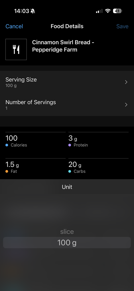 The other way to add products is by taking a photo of it. In this case, you can simply point the camera at something and take a picture. It’ll try to figure out the weight of the product and find a match. Below, I had some bread from a bakery in the US that DesFit bought over last month (it was frozen). This isn’t in a database, but did have a reasonably good guess on what it was: